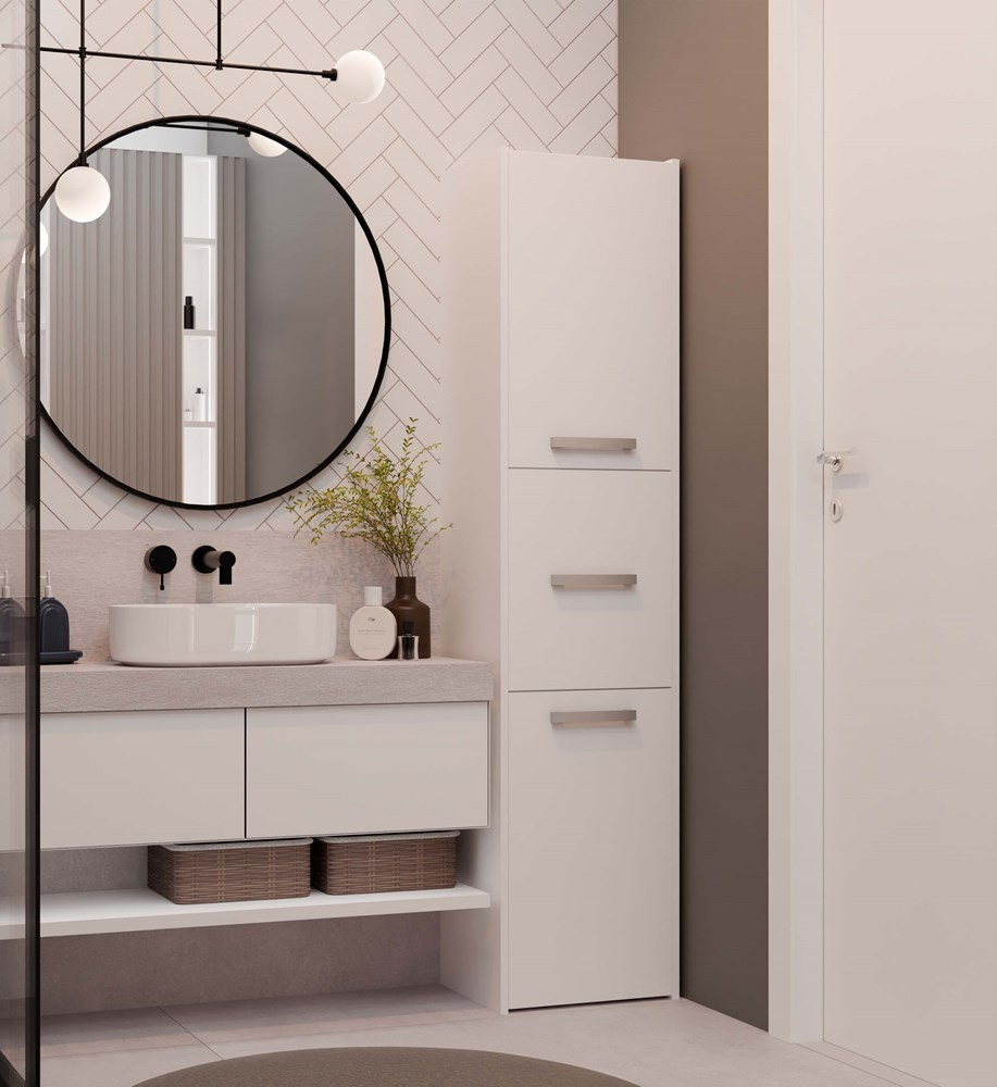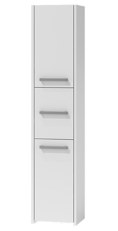Vysokou koupelnovou skříňku Saly v minimalistickém designu ocení milovníci jednoduchosti a elegance. Je vyrobená ze snadno udržovatelného lamina, hrany jsou povrchově upravené ABS plastem - vyznačuje se vysokou mechanickou a chemickou odolností.