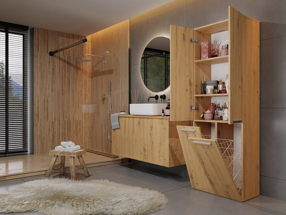 Stylová skříňka Noeli vám díky praktickému úložnému prostoru pomůže vytvořit dokonale organizovanou a útulnou koupelnu. Nadčasový design splní očekávání všech, kteří oceňují kombinaci jednoduchosti a elegance. Skříňka je vyrobená ze snadno udržovatelného lamina, hrany jsou povrchově upravené ABS plastem (vyznačuje se vysokou mechanickou a chemickou odolností).
