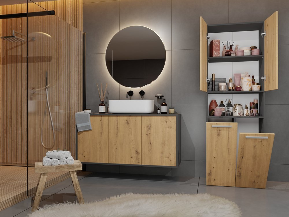 Stylová skříňka Noeli vám díky praktickému úložnému prostoru pomůže vytvořit dokonale organizovanou a útulnou koupelnu. Nadčasový design splní očekávání všech, kteří oceňují kombinaci jednoduchosti a elegance. Skříňka je vyrobená ze snadno udržovatelného lamina, hrany jsou povrchově upravené ABS plastem (vyznačuje se vysokou mechanickou a chemickou odolností).