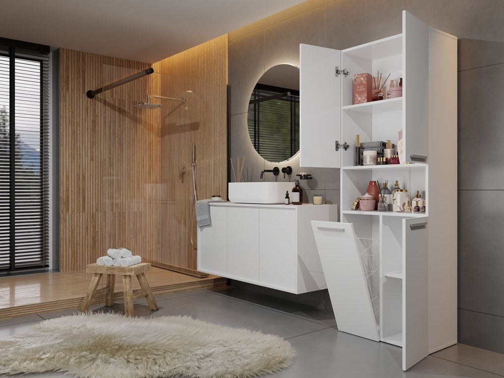 Stylová skříňka Noeli vám díky praktickému úložnému prostoru pomůže vytvořit dokonale organizovanou a útulnou koupelnu. Nadčasový design splní očekávání všech, kteří oceňují kombinaci jednoduchosti a elegance. Skříňka je vyrobená ze snadno udržovatelného lamina, hrany jsou povrchově upravené ABS plastem (vyznačuje se vysokou mechanickou a chemickou odolností).