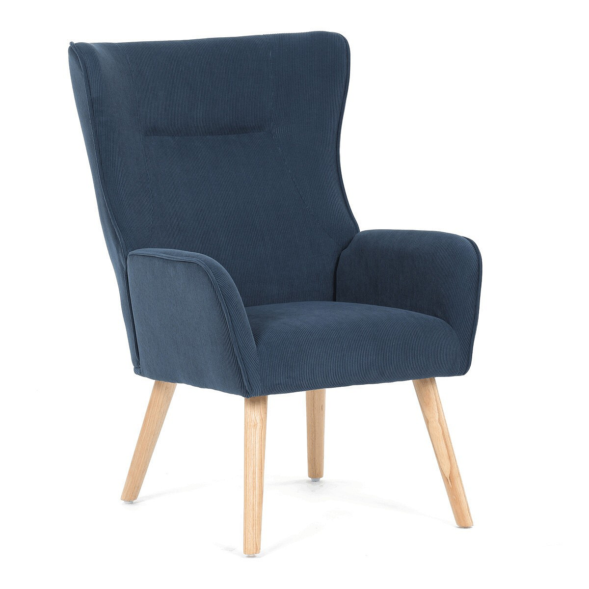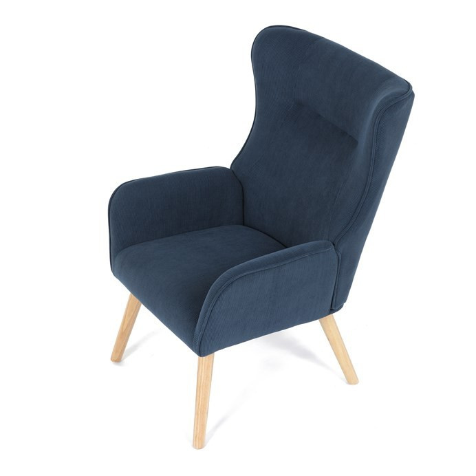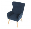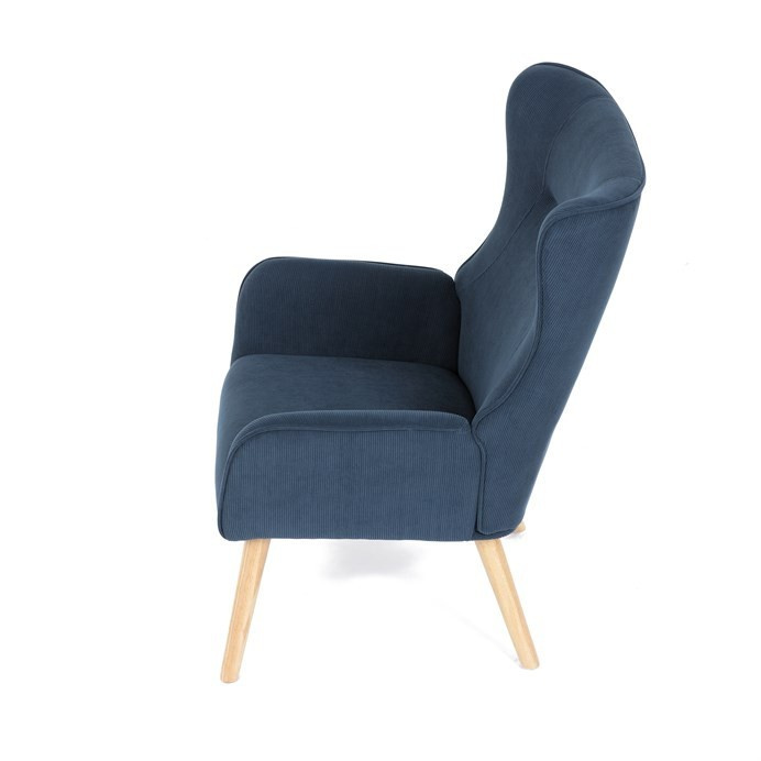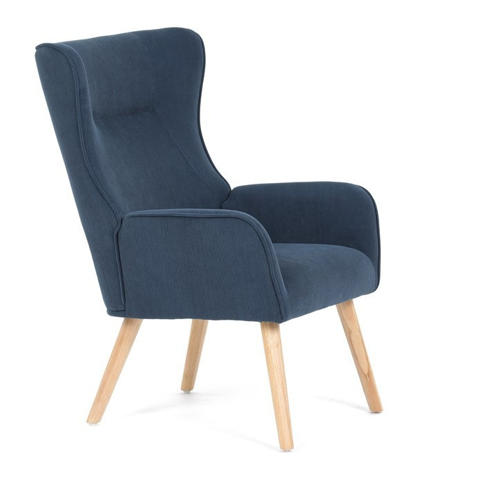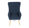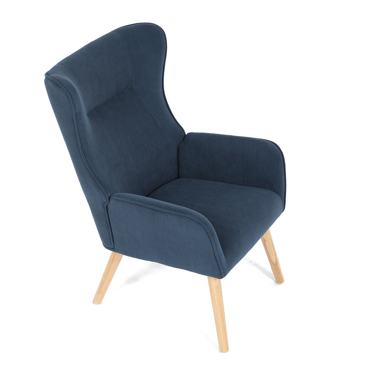 Křeslo typu ušák s potahem z modré manšestrové látky nabízí pohodlné sezení s výrazným vizuálním efektem díky jemné textuře manšestru. Sedák a opěradlo jsou vyplněné měkkou výplní, která zajišťuje komfort při delším posezení. Masivní nohy z kaučukovníku poskytují stabilní a pevnou oporu, přičemž jejich přírodní odstín kontrastuje s tmavě modrým potahem. Ergonomický tvar opěradla s mírně zvýšenými bočnicemi podporuje správnou polohu těla. Křeslo je určeno pro interiéry, kde vynikne jeho kombinace tradičního stylu a kvalitního materiálového provedení.
