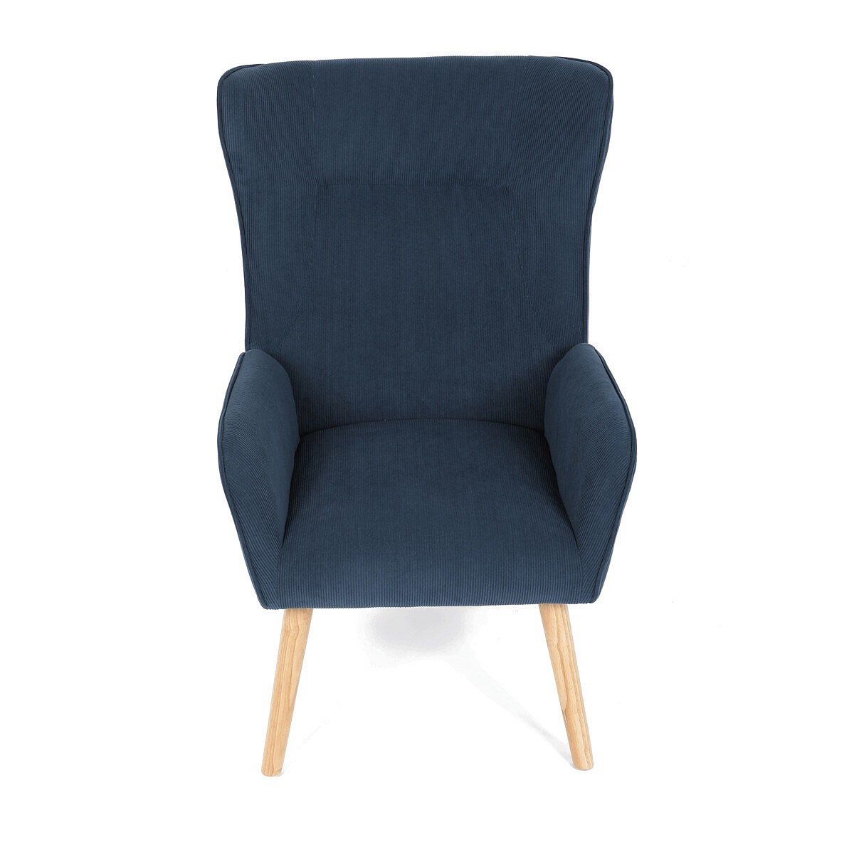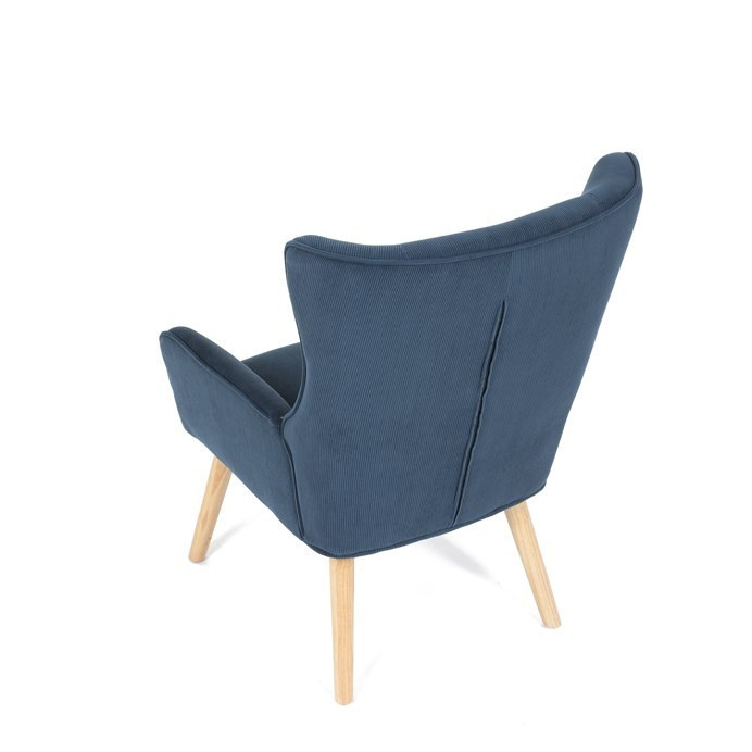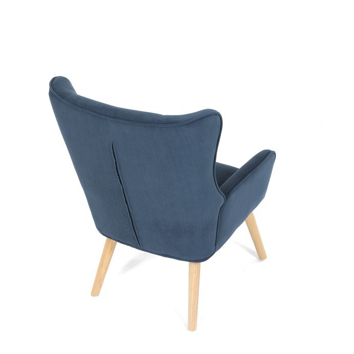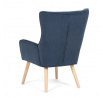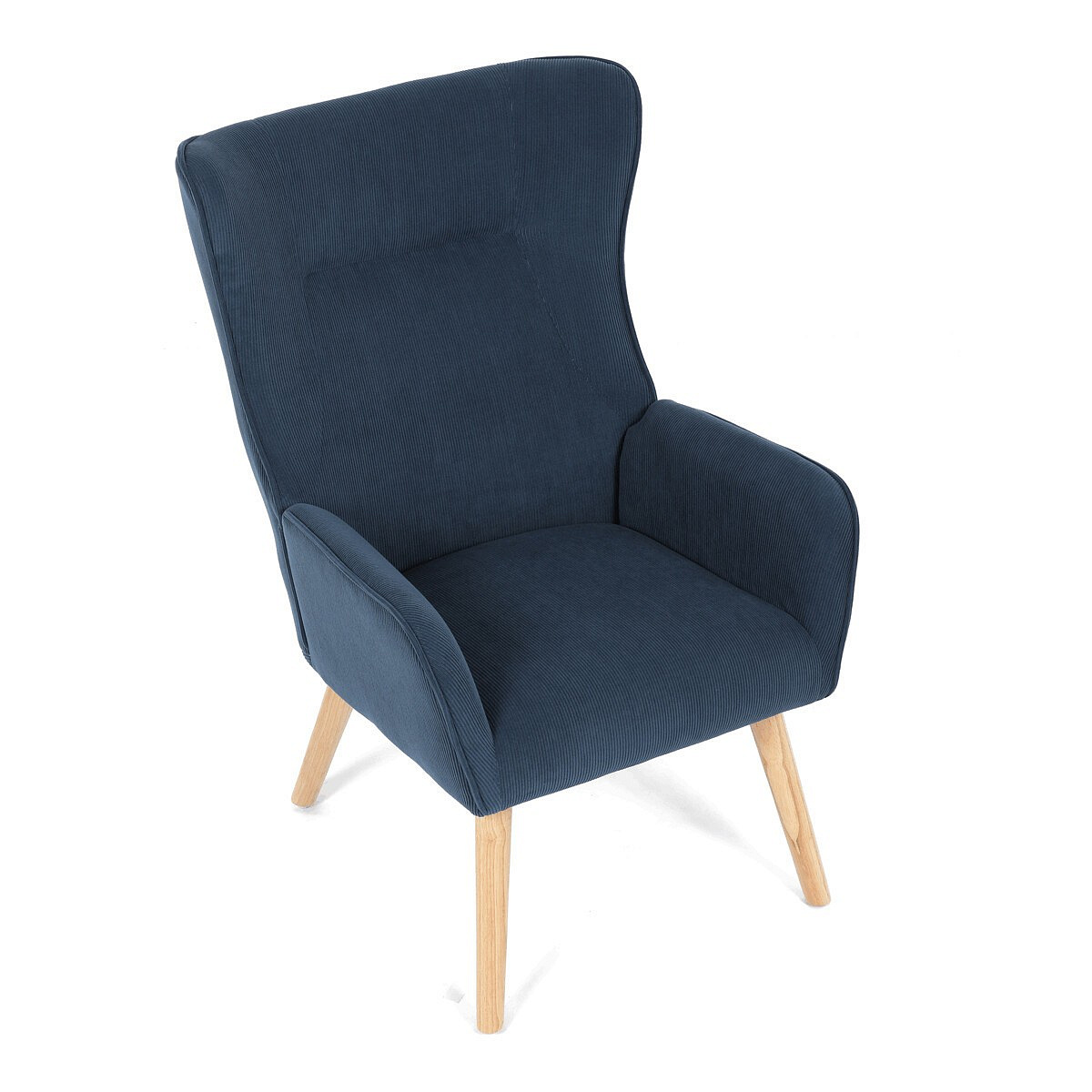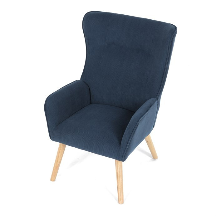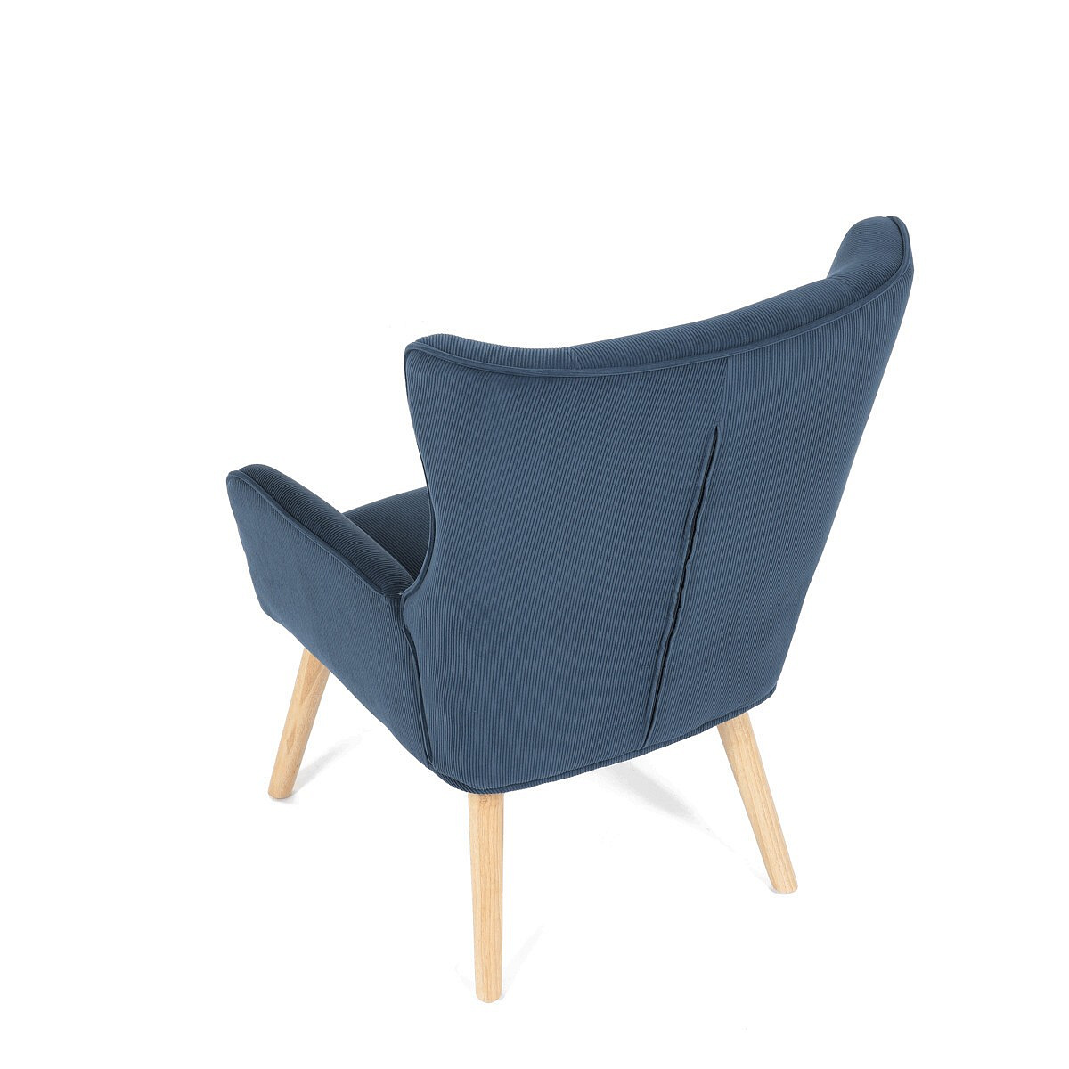 Křeslo typu ušák s potahem z modré manšestrové látky nabízí pohodlné sezení s výrazným vizuálním efektem díky jemné textuře manšestru. Sedák a opěradlo jsou vyplněné měkkou výplní, která zajišťuje komfort při delším posezení. Masivní nohy z kaučukovníku poskytují stabilní a pevnou oporu, přičemž jejich přírodní odstín kontrastuje s tmavě modrým potahem. Ergonomický tvar opěradla s mírně zvýšenými bočnicemi podporuje správnou polohu těla. Křeslo je určeno pro interiéry, kde vynikne jeho kombinace tradičního stylu a kvalitního materiálového provedení.