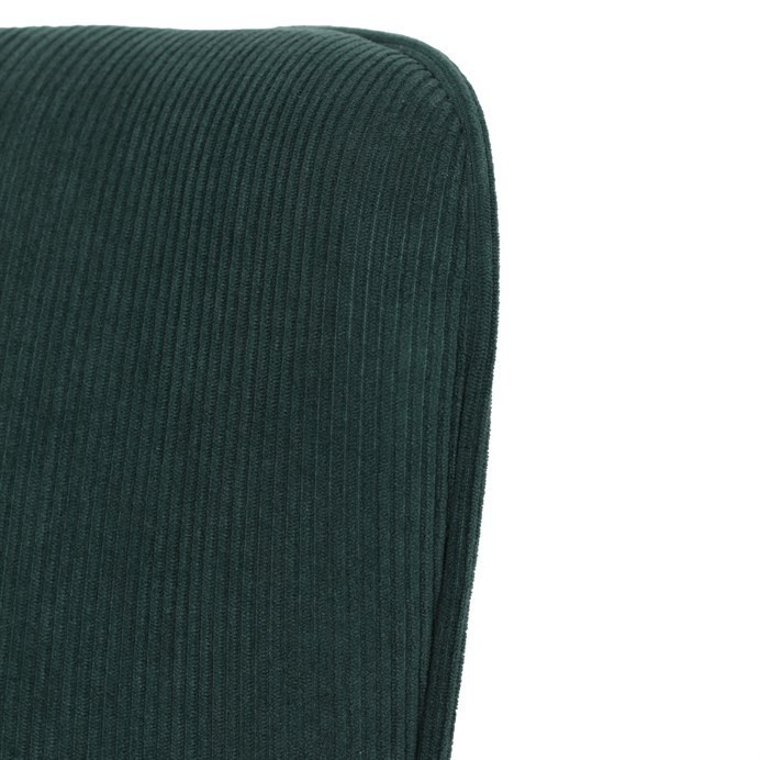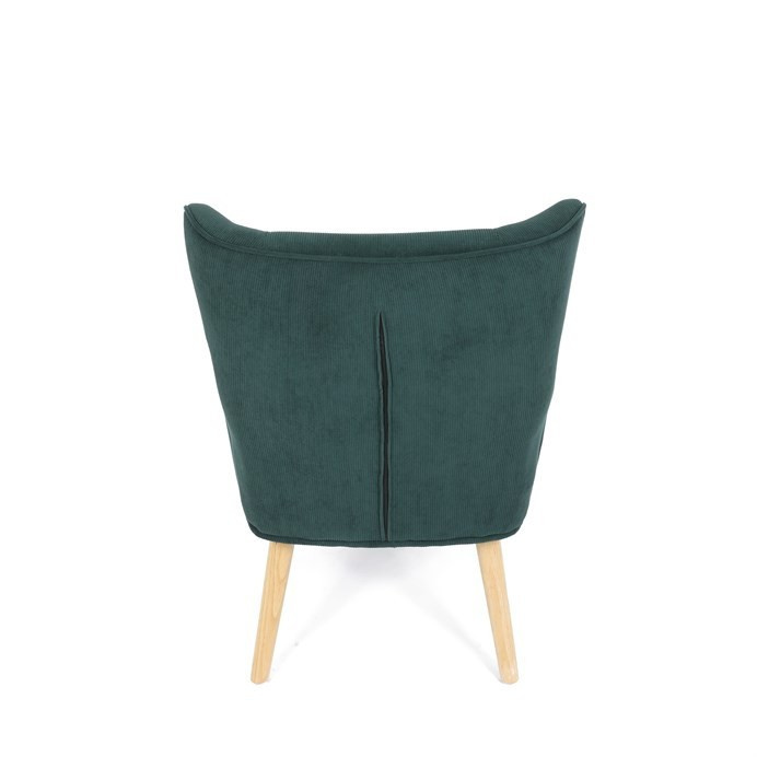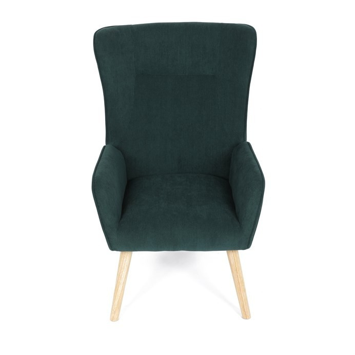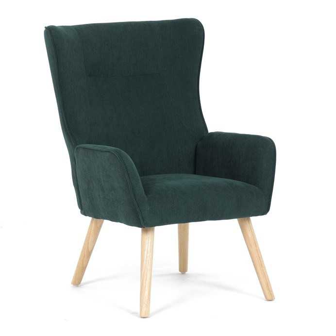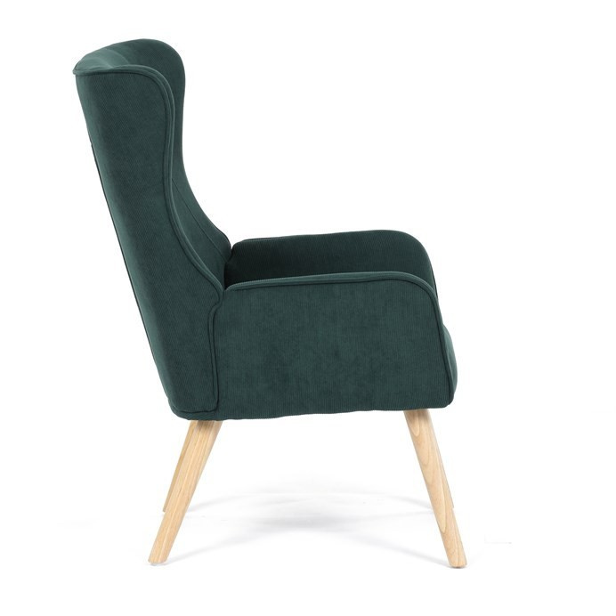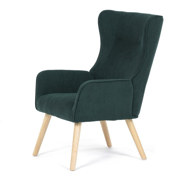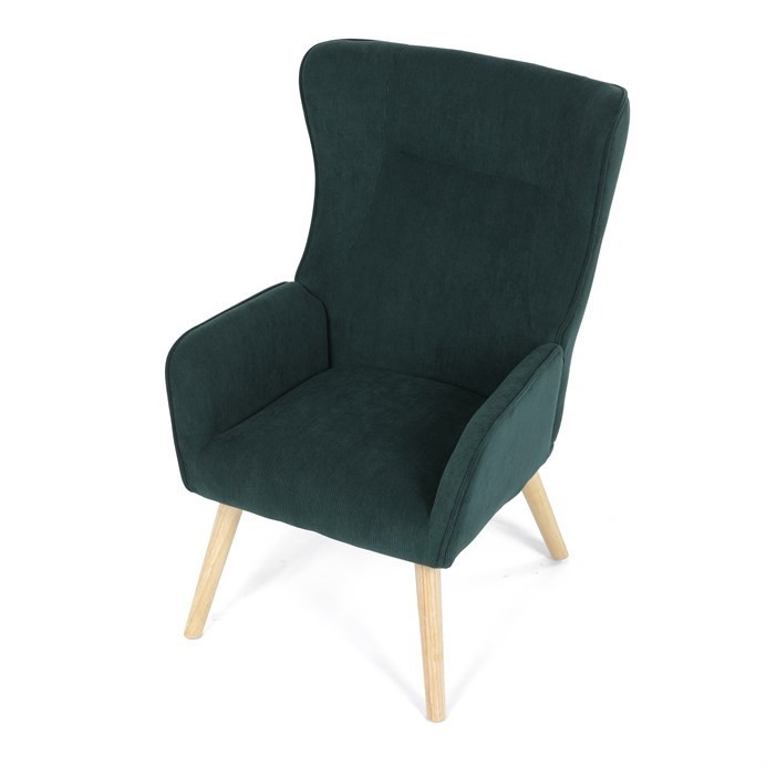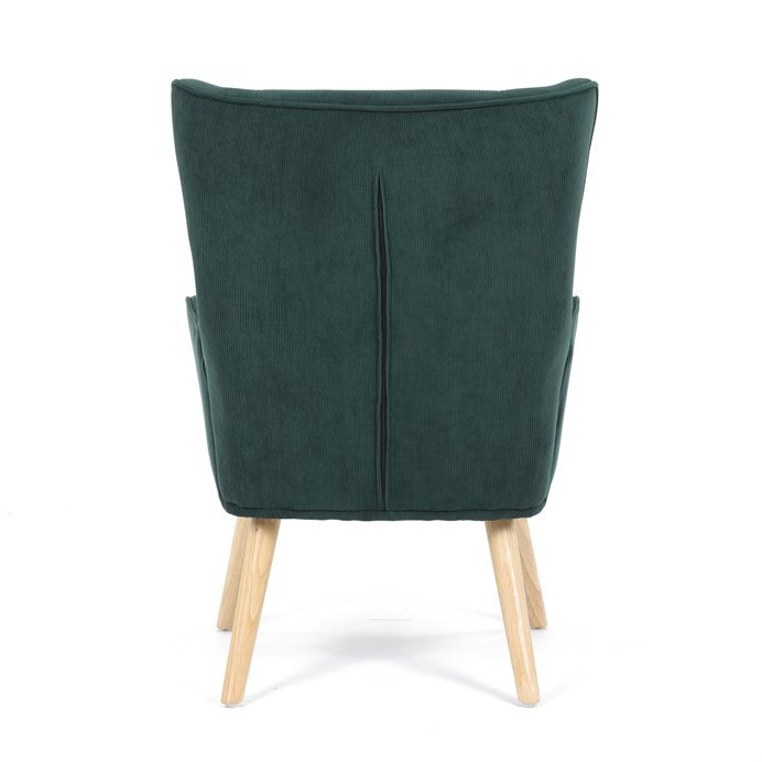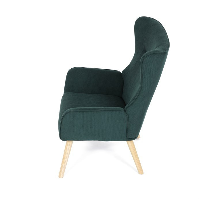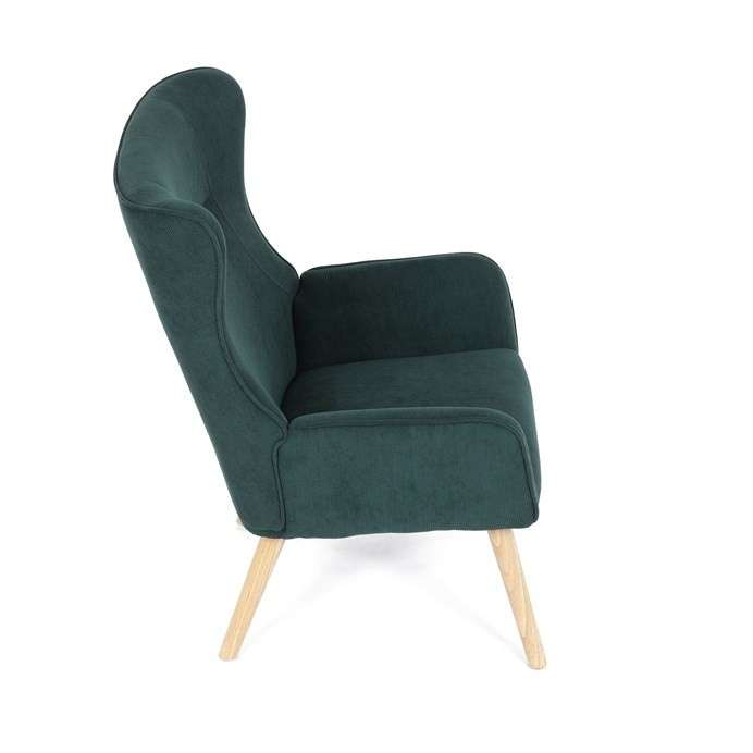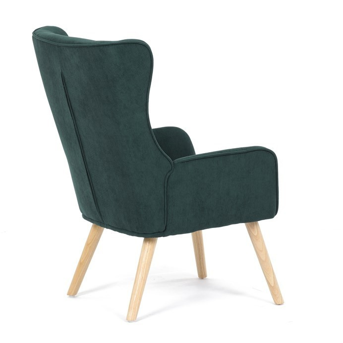 Křeslo v designu ušáka je potaženo zelenou manšestrovou látkou, která nabízí příjemnou texturu a decentní lesk. Masivní nohy z kaučukovníku zajišťují stabilitu a pevnost, přičemž jejich přírodní odstín kontrastuje s tmavším odstínem potahu. Ergonomicky tvarované opěradlo s výraznými křídly poskytuje oporu hlavy a ramenům, zatímco čalouněné područky doplňují komfort při sezení. Díky kvalitnímu materiálu a pevnému provedení je křeslo vhodné pro dlouhodobé užívání v obývacích pokojích či čtecích koutech.