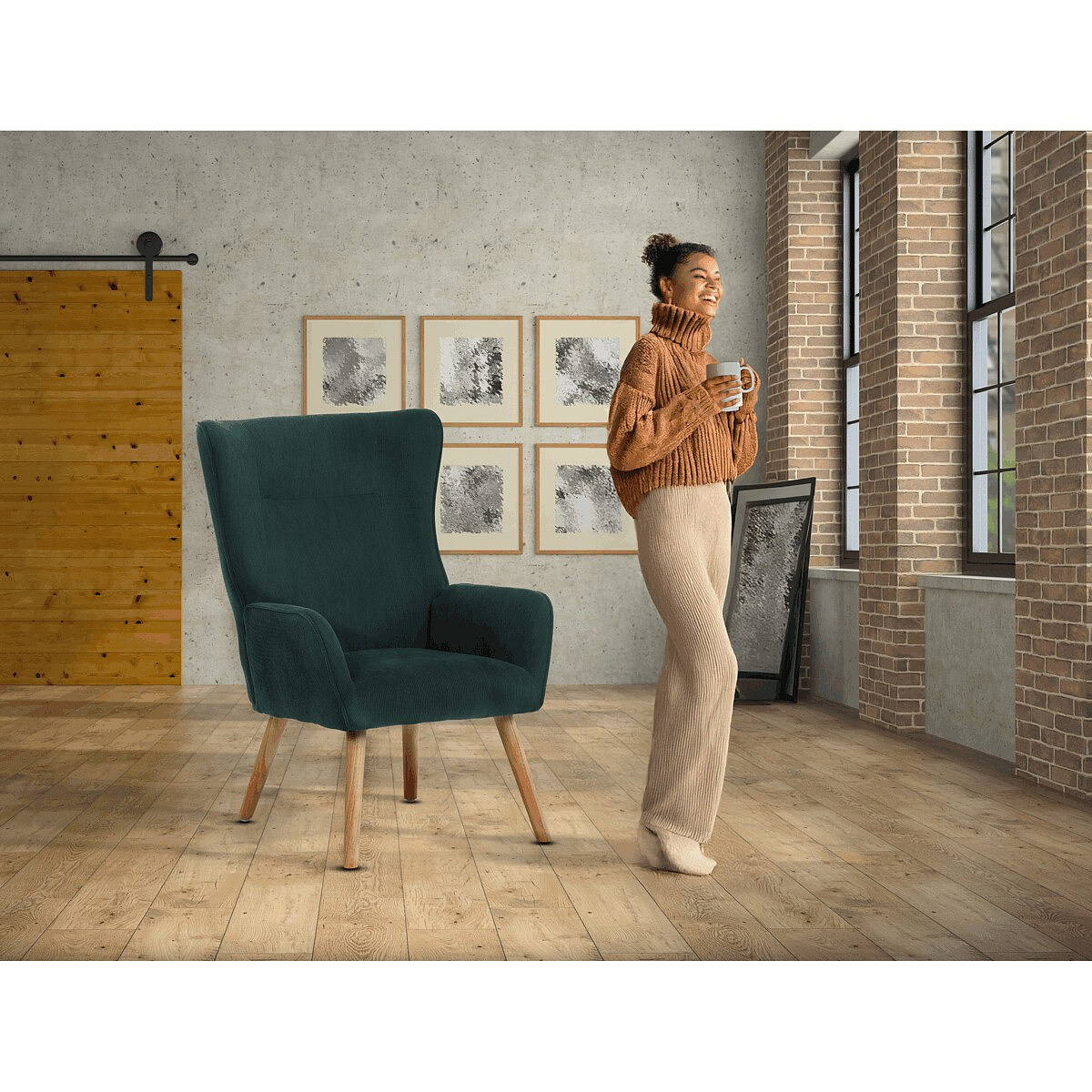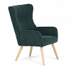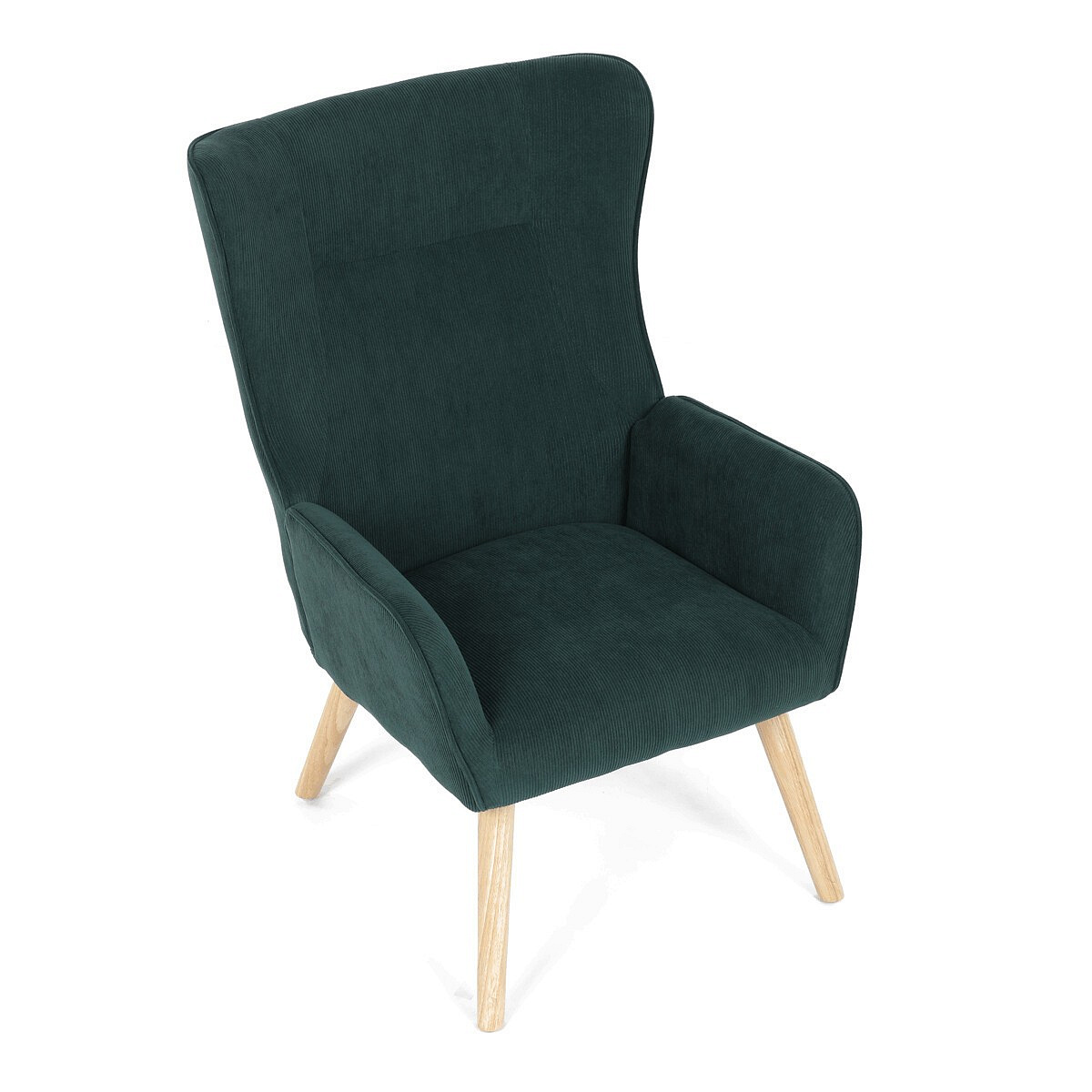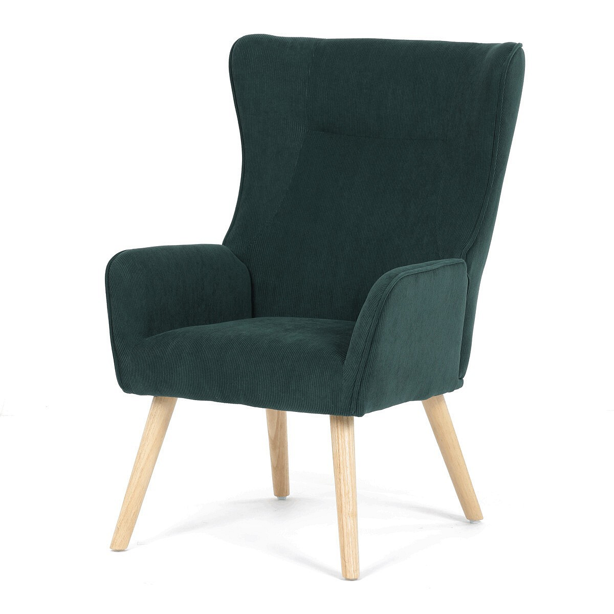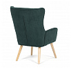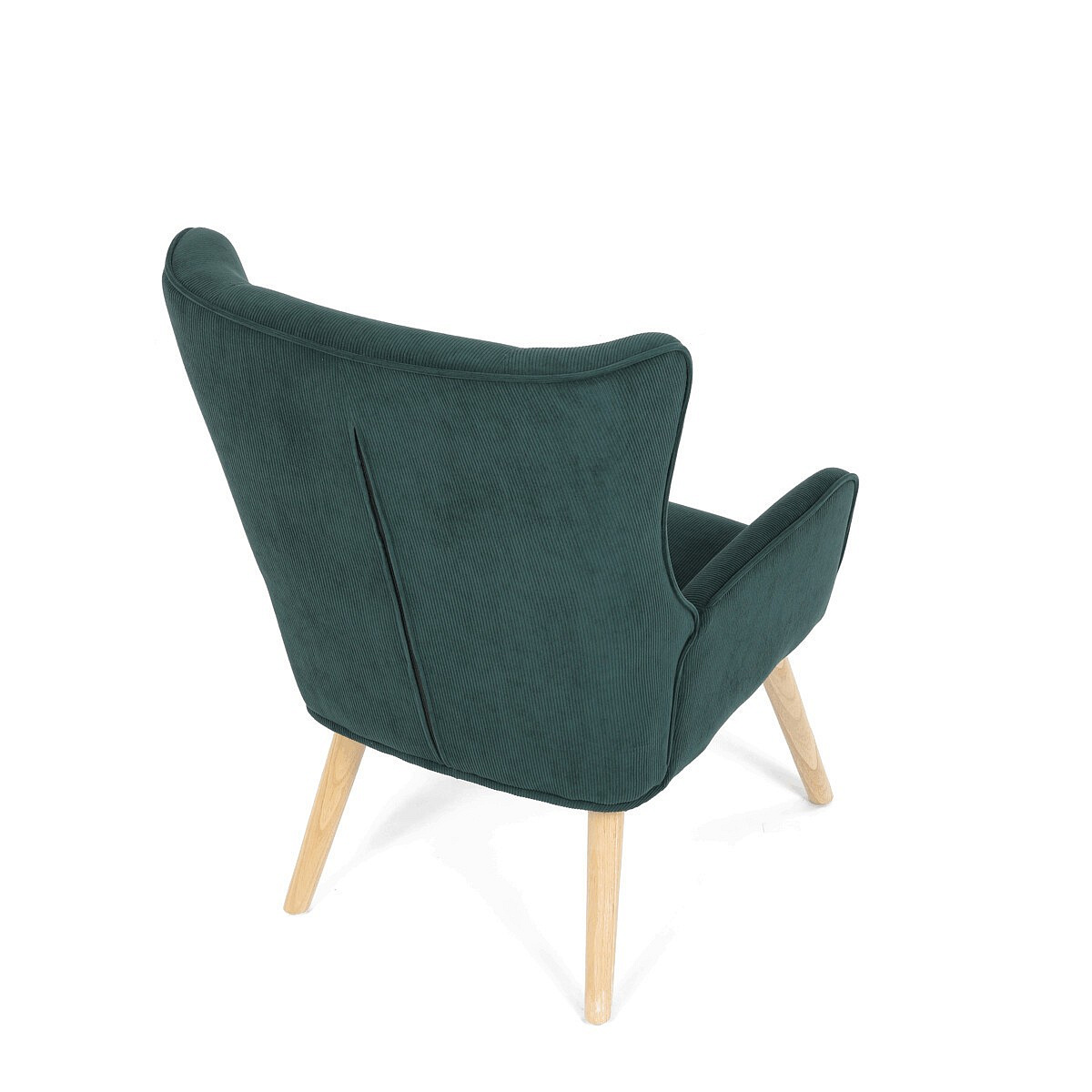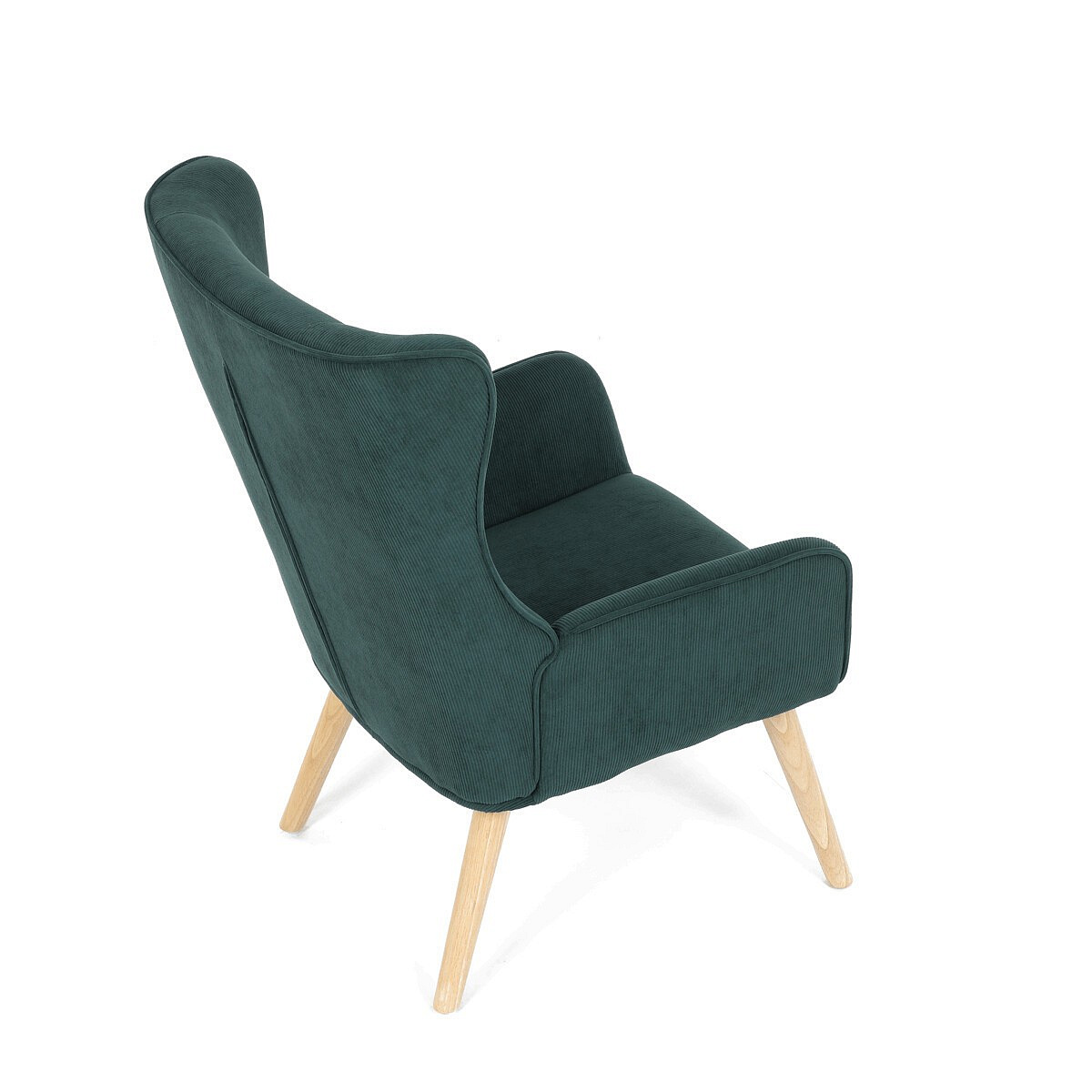 Křeslo v designu ušáka je potaženo zelenou manšestrovou látkou, která nabízí příjemnou texturu a decentní lesk. Masivní nohy z kaučukovníku zajišťují stabilitu a pevnost, přičemž jejich přírodní odstín kontrastuje s tmavším odstínem potahu. Ergonomicky tvarované opěradlo s výraznými křídly poskytuje oporu hlavy a ramenům, zatímco čalouněné područky doplňují komfort při sezení. Díky kvalitnímu materiálu a pevnému provedení je křeslo vhodné pro dlouhodobé užívání v obývacích pokojích či čtecích koutech.