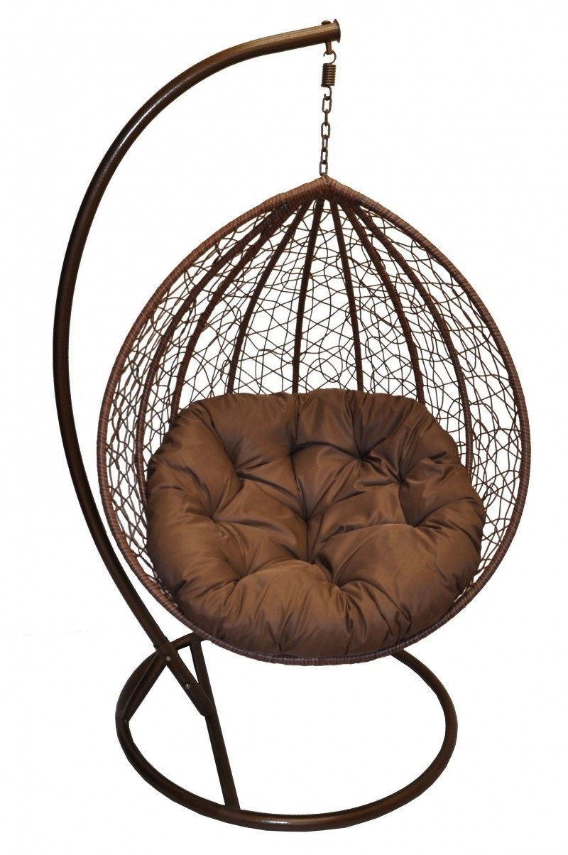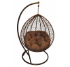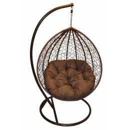 Závěsná houpačka s kovovou konstrukcí a výpletem z umělého ratanu. Součástí je nadýchaný polštář v hnědé barvě potahové látky a také masivní závěsná konstrukce sloužící k zavěšení houpačky. | Závěsná konstrukce je vyrobena z masivních ocelových trubek. Průměr základny je 105 cm a výška je 195 cm. Závěsný sedák má velikost 105x72x120 cm. Nosnost houpačky je 110 kg. Houpačka je vypletena z umělého ratanu, který je odolný proti povětrnostním vlivům. Houpačka je tedy určena i pro venkovní použití.