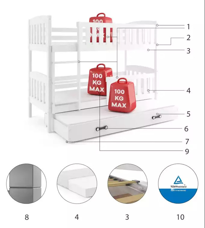 - Certyfikowane łóżko - jakość i bezpieczeństwo zgodnie z normami TUV.