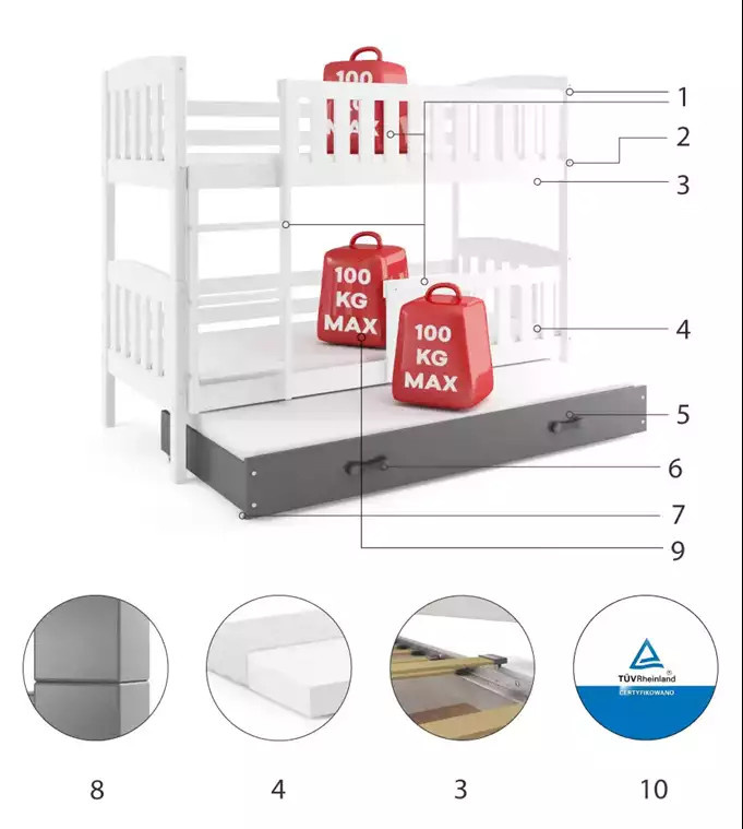 - Certyfikowane łóżko - jakość i bezpieczeństwo zgodnie z normami TUV.