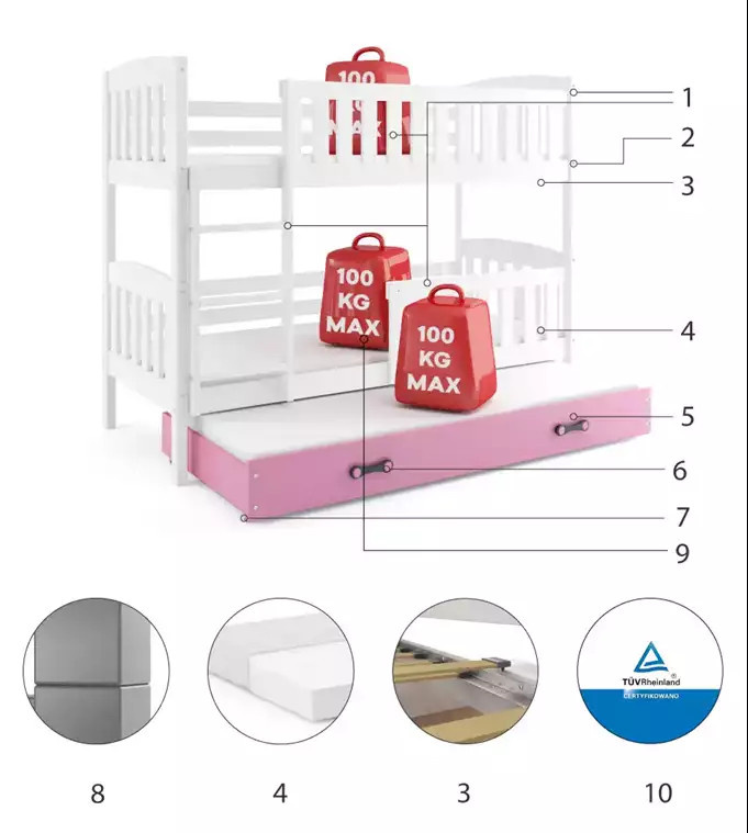 - Certyfikowane łóżko - jakość i bezpieczeństwo zgodnie z normami TUV.