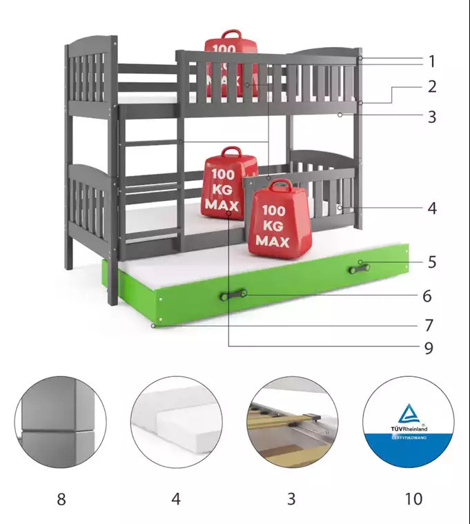 - Certyfikowane łóżko - jakość i bezpieczeństwo zgodnie z normami TUV.