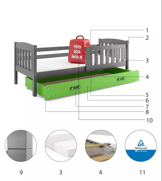 KUBUŚ PARTEROWE RAMA GRAFIT SZUFLADA ZIELONY BEZ MATERACY 80 X 190 KPL