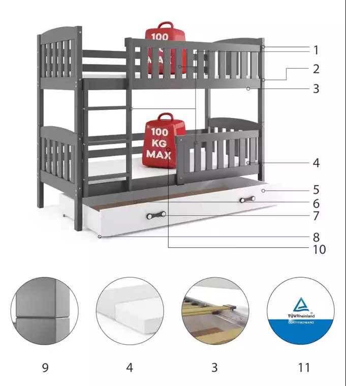 - Certyfikowane łóżko - jakość i bezpieczeństwo zgodnie z normami TUV.