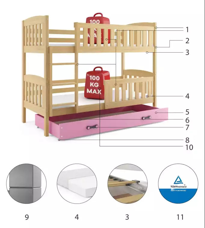 KUBUŚ PIĘTROWE RAMA SOSNA SZUFLADA RÓŻOWY 90 X 200 KPL