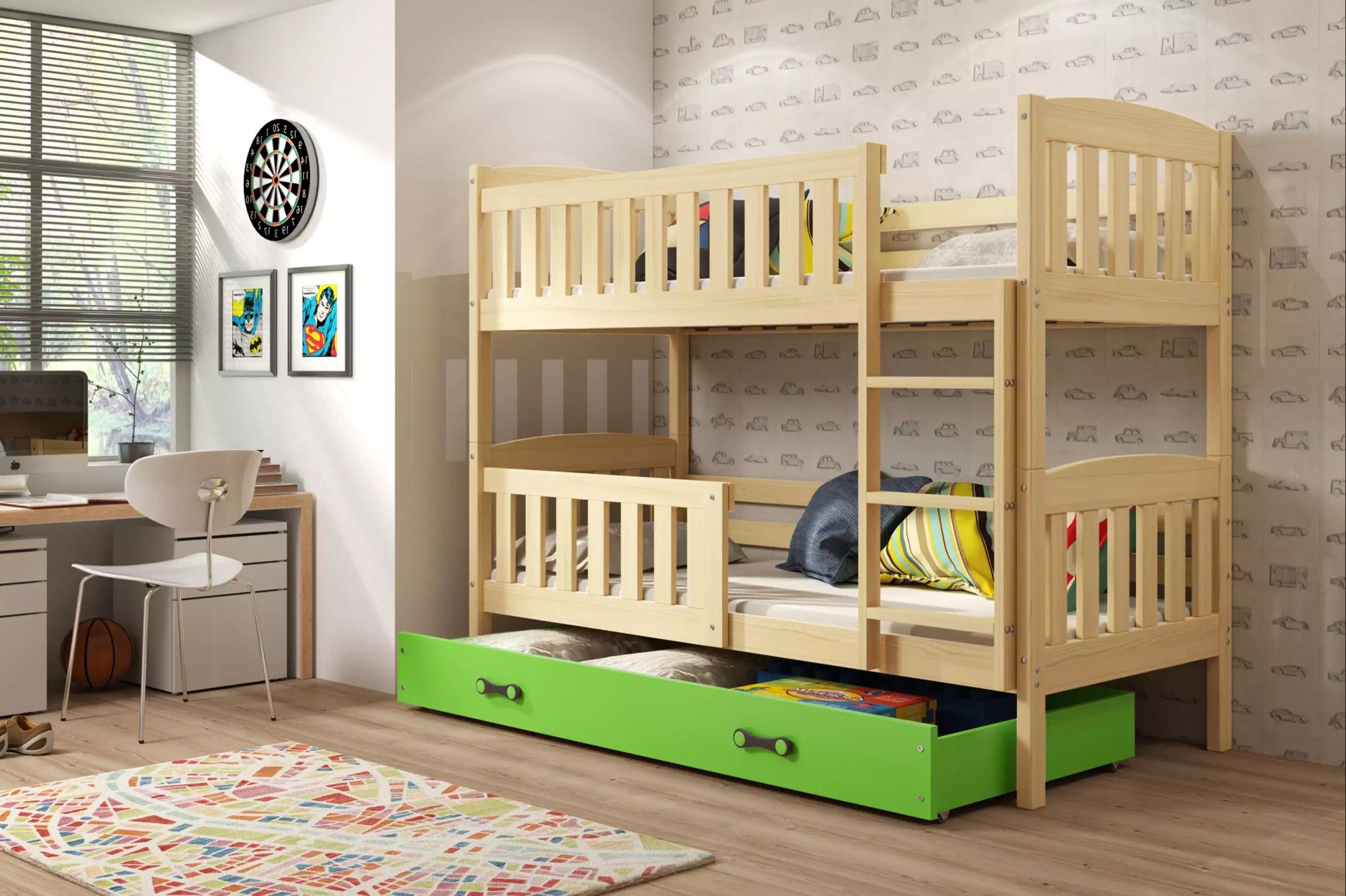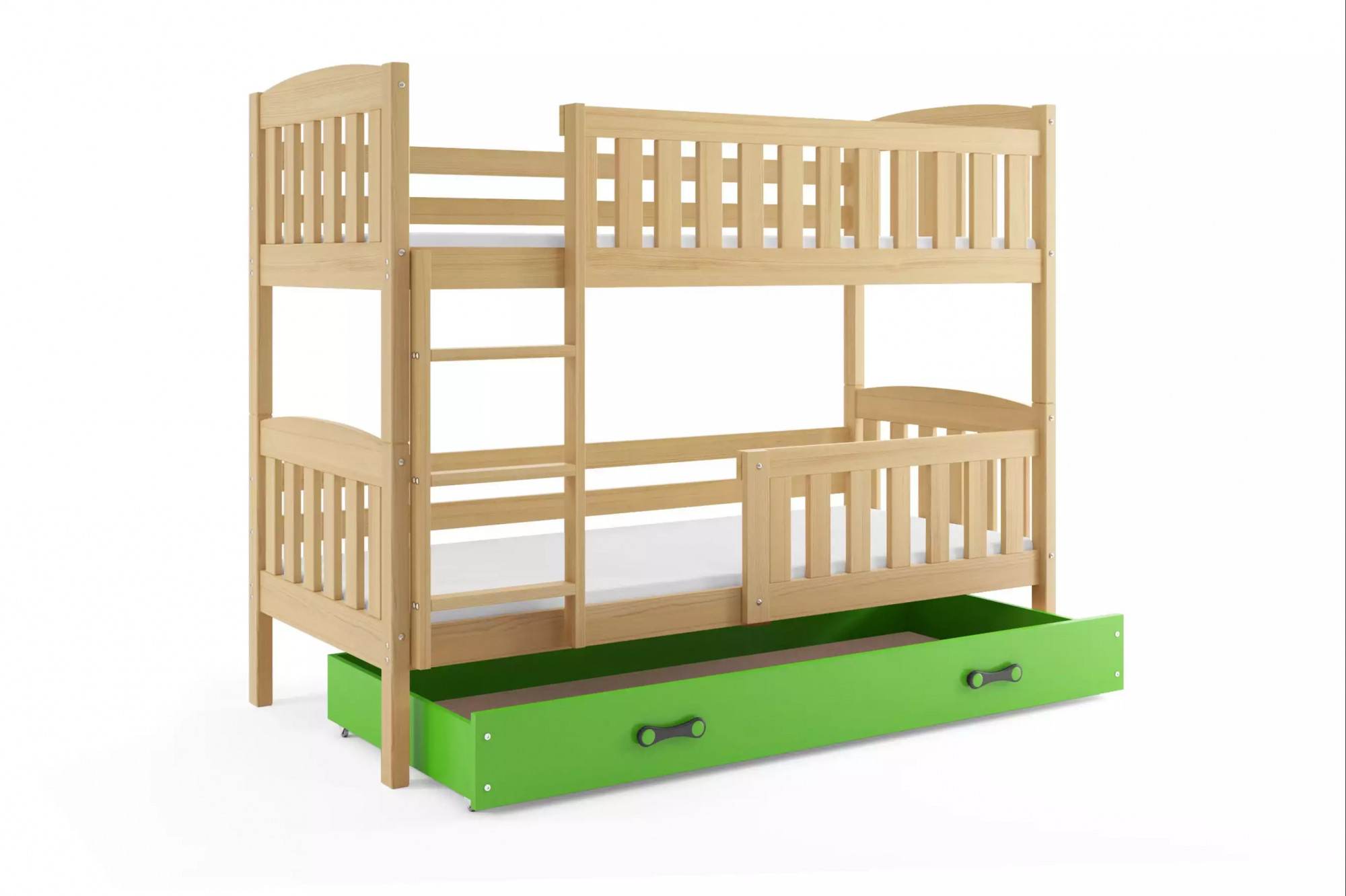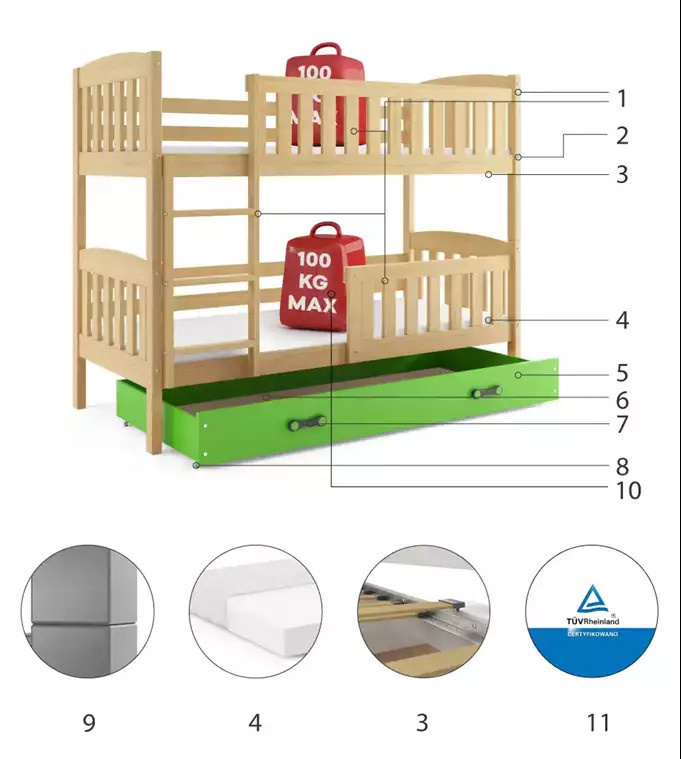 KUBUŚ PIĘTROWE RAMA SOSNA SZUFLADA ZIELONY 90 X 200 KPL