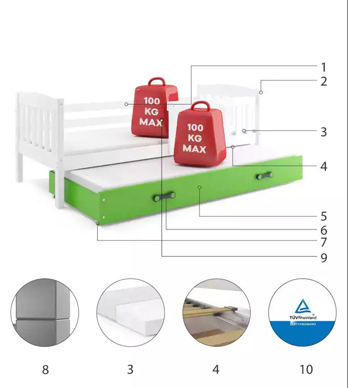 - Certyfikowane łóżko - jakość i bezpieczeństwo zgodnie z normami TUV.