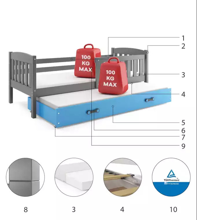- Certyfikowane łóżko - jakość i bezpieczeństwo zgodnie z normami TUV.