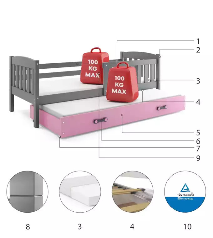 - Certyfikowane łóżko - jakość i bezpieczeństwo zgodnie z normami TUV.