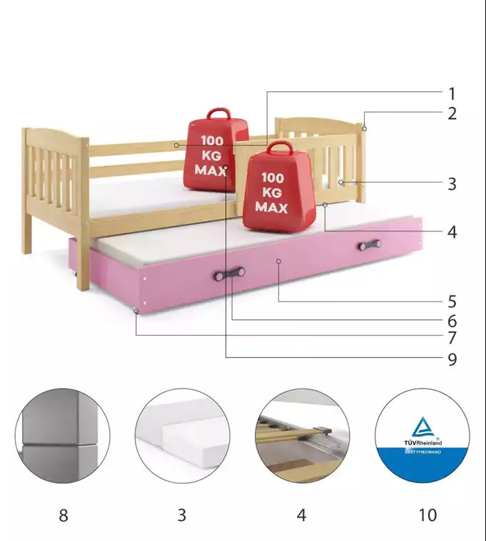 - Certyfikowane łóżko - jakość i bezpieczeństwo zgodnie z normami TUV.