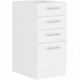 Spodní kuchyňská skříňka je vyrobena z lamina tloušťky 16 mm bílé barvy. Tato skříňka se skládá ze tří nižších a jedné vyšší zásuvky. Na ty si můžete buď horizontálně nebo vertikálně namontovat kovové či plastové úchytky (délka 140 mm). Skříňka je vyrobena z kvalitních MDF desek. Dvířka jsou vybavena systémem tichého zavírání. Poskládejte si z naší bohaté nabídky skříněk moderní a designovou kuchyň podle Vašich představ. Skříňka je dodávaná v demontu. Součástí je montážní plánek včetně všech potřebných spojovacích materiálů.