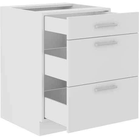 Spodní kuchyňská skříňka je vyrobena z lamina tloušťky 16 mm bílé barvy. Skříňka je složena z jedné nižší a dvěmi vyššími zásuvkami. Dvířka mají plastové nebo kovové úchytky (délka 140 mm), které lze namontovat horizontálně či vertikálně. Dále jsou dvířka vybavena systémem tichého zavírání. Skříňka je vyrobena z kvalitních MDF desek. Poskládejte si z naší bohaté nabídky skříněk moderní a designovou kuchyň podle Vašich představ. Skříňka je dodávaná v demontu. Součástí je montážní plánek včetně všech potřebných spojovacích materiálů.