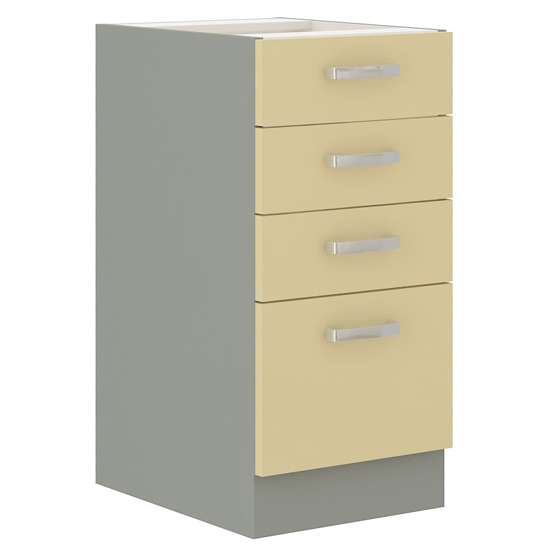 Tato spodní kuchyňská skříňka je vyrobena z lamina tloušťky 16 mm v lesklé krémové barvě. Koprus je v šedém provedení. Skříňka je tvořena čtyřmi praktickými šuplíky. Tři nižší a jeden vyšší šuplík vám poskytne dostatek místa k uložení všeho co budete potřebovat. Dvířka mají lesklé kovové úchytky a (délka 135mm) a jsou vybavena systémem tichého zavírání. Skříňka je vyrobena z kvalitních MDF desek. Poskládejte si z naší bohaté nabídky skříněk moderní a designovou kuchyň podle Vašich představ. Skříňka je dodávaná v demontu. Součástí je montážní plánek včetně všech potřebných spojovacích materiálů.