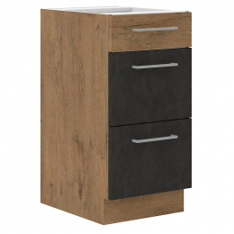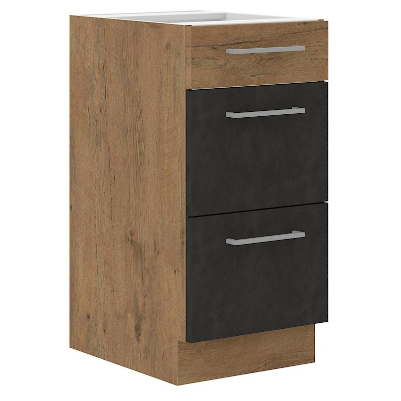 Spodní kuchyňská skříňka je vyrobena z lamina tloušťky 16 mm barvy matera mat. Korpus skříňky je v provedení dub lancelot. Tato skříňka se skládá z jedné nižší a dvou vyšších zásuvek. Všechny s kovovými úchytky (délka 192mm). Skříňka je vyrobena z kvalitních MDF desek. Dvířka jsou vybavena systémem tichého zavírání. Poskládejte si z naší bohaté nabídky skříněk moderní a designovou kuchyň podle Vašich představ. V doplňkových fotografiích najdete pro inspiraci fotky kuchyní, které jsou z těchto skříněk sestaveny. Skříňka je dodávaná v demontu. Součástí je montážní plánek včetně všech potřebných spojovacích materiálů.