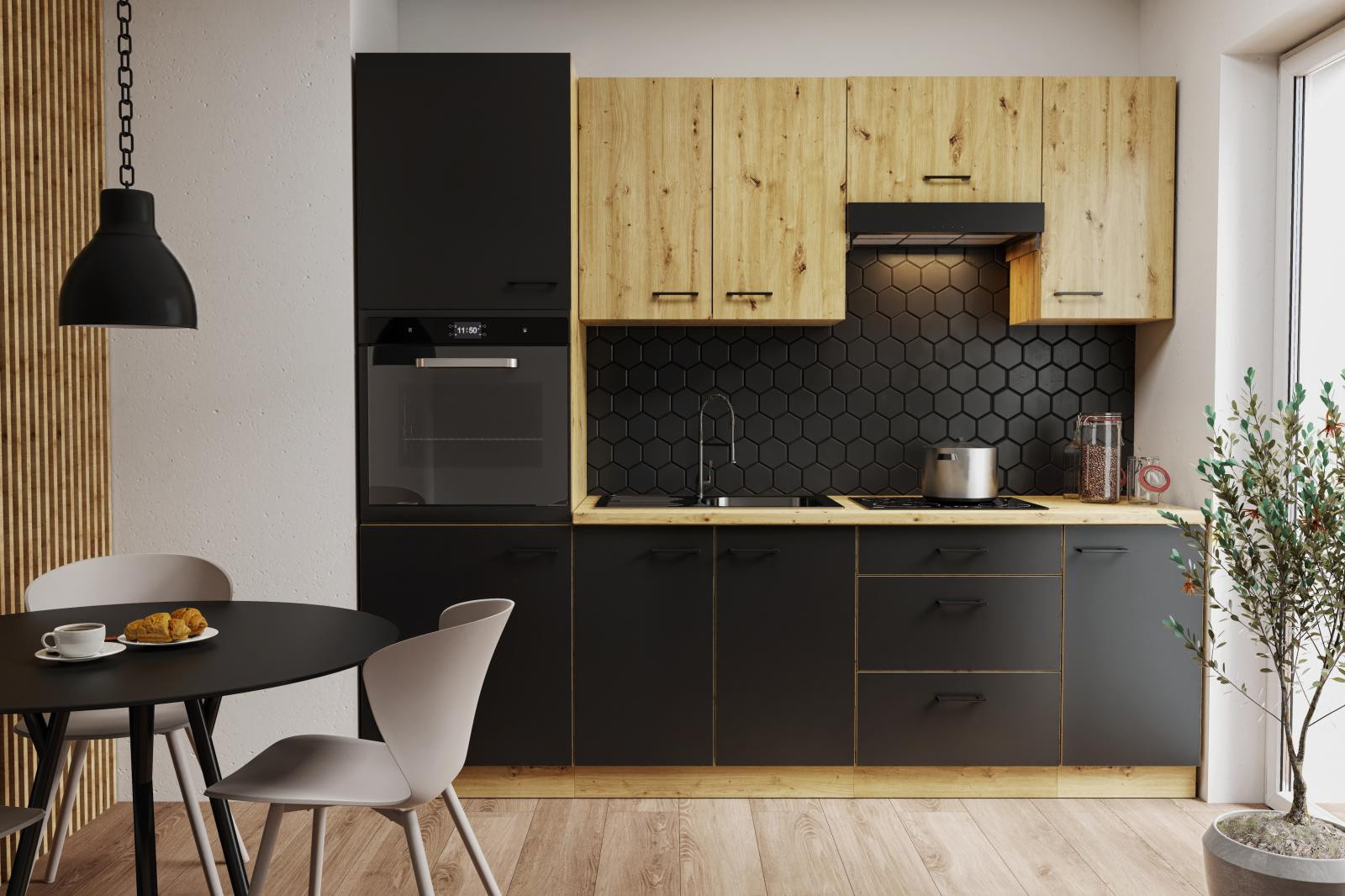Horní kuchyňská skříňka je vyrobena z lamina tloušťky 16 mm barvy dub artisan. Vnitřek skříňky má pak barvu bílou. Dvířka mají černý plastový úchyt (délka 136 mm). Jsou vybavena systémem tichého zavírání a při montáži si můžete zvolit pravé či levé otevírání dveří. Vnitřek skříňky obsahuje celkem dvě police, které Vám poskytnou dostatek místa k uskladnění všeho, co budete v kuchyni potřebovat. Poskládejte si z naší bohaté nabídky skříněk moderní a designovou kuchyň podle Vašich představ. Skříňka je dodávaná v demontu. Součástí je montážní plánek včetně všech potřebných spojovacích materiálů.