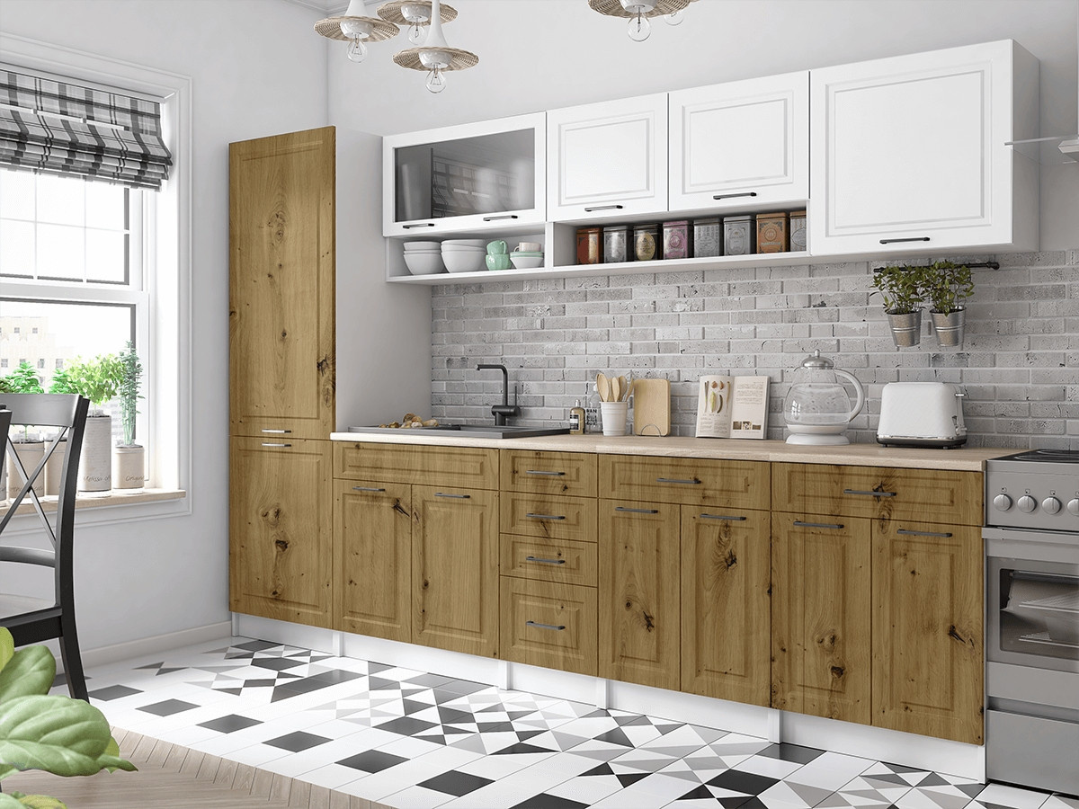 Kuchyňská linka Brigita je vyrobená ve venkovském stylu, který se hodí do kuchyně v paneláku i v rodinném domě. Tento styl má jedinečnou schopnost proměnit Vaši kuchyň v útulnou a zároveň funkční místnost, kde bude radost vařit i péct. Kuchyňská linka Brigita nabízí dostatek úložného i pracovního prostoru. Všechny skříňky jsou samostatné, takže si je můžete sestavit tak, jak Vám to vyhovuje. Korpusy skříněk jsou vyrobené z lamina 18 mm s hranami ABS a dvířka jsou MDF 16mm. Všechny skříňky jsou dodávány v demontu. Součástí balení je montážní plánek včetně všech potřebných spojovacích prvků. Cena je uvedena za sestavu vyobrazenou na úvodní fotografii BEZ PRACOVNÍ DESKY, s úchytkami, které jsou vyobrazeny v doplňkových fotografiích. Pracovní desku lze dokoupit nad každou skříňku zvlášť podle její šíře. Vyobrazené spotřebiče, dřez, baterie, doplňky a dekorace nejsou v ceně. Kuchyň bude dodaná s bílými korpusy a dvířky v kombinaci bílá a artisan. Zobrazení barev na fotografii se může od skutečnosti lišit.