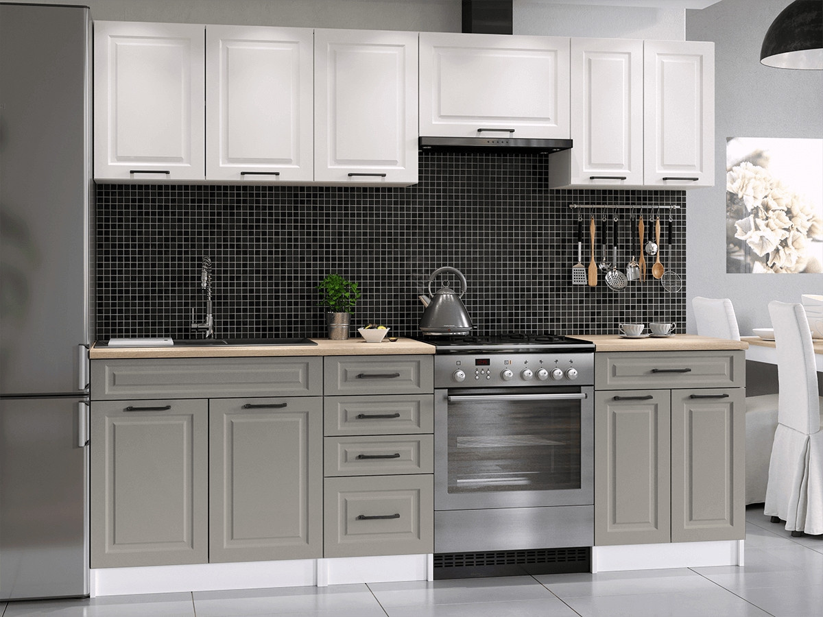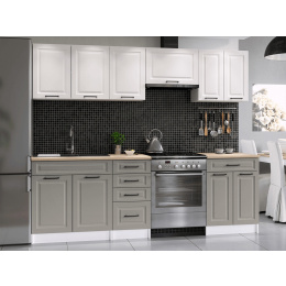 Kuchyňská linka Ilona je vyrobená ve venkovském stylu, který se hodí do kuchyně v paneláku i v rodinném domě. Tento styl má jedinečnou schopnost proměnit Vaši kuchyň v útulnou a zároveň funkční místnost, kde bude radost vařit i péct. Kuchyňská linka Ilona nabízí dostatek úložného i pracovního prostoru. Všechny skříňky jsou samostatné, takže si je můžete sestavit tak, jak Vám to vyhovuje. Korpusy skříněk jsou vyrobené z lamina 18 mm s hranami ABS a dvířka jsou MDF 16mm. Všechny skříňky jsou dodávány v demontu. Součástí balení je montážní plánek včetně všech potřebných spojovacích prvků. Cena je uvedna za sestavu vyobrazenou na úvodní fotografii BEZ PRACOVNÍ DESKY, s úchytkami, které jsou vyobrazeny v doplňkových fotografiích. Pracovní desku lze dokoupit nad každou skříňku zvlášť podle její šíře. Vyobrazené spotřebiče, dřez, baterie, doplňky a dekorace nejsou v ceně. Kuchyň bude dodaná s bílými korpusy a dvířky v kombinaci bílá a světle šedá. Zobrazení barev na fotografii se může od skutečnosti lišit.