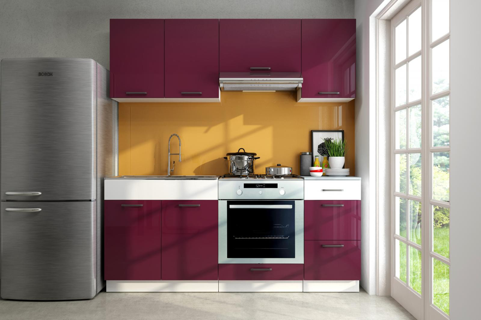 Potýkáte-li se s malými prostory a každý centimetr je pro Vás důležitý, pak je kuchyňská linka Lars tou správnou volbou pro Váš domov. Je vyrobena v moderním designu a skříňky si můžete sestavit buď tak, jak vidíte na úvodní fotografii, nebo si je můžete sestavit podle svých potřeb. Korpusy skříněk jsou bílé, dvířka jsou ve vysokém lesku fialové barvy. Všechny skříňky této sestavy jsou dodávány v demontu. Součástí je montážní plánek včetně všech potřebných spojovacích materiálů. Cena je uvedna za sestavu vyobrazenou na úvodní fotografii BEZ PRACOVNÍ DESKY. Spotřebiče,baterie a dekorace nejsou v ceně.