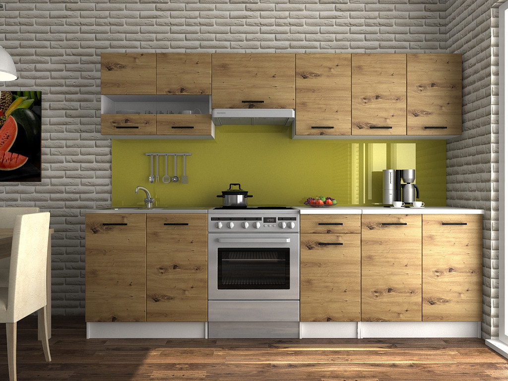 Kuchyňská linka Luigi je ideální volbou pro Vaši kuchyň. Je moderní a zároveň i praktická. Skříňky nabízejí dostatek úložného prostoru. Je vyrobená z lamina, které je odolné a snadné na údržbu. Díky svým rozměrům je vhodná i do malých kuchyní. Skříňky si můžete sestavit libovolně. Kuchyňská linka je dodávaná v demontu. Součástí balení je montážní plánek včetně všech potřebných spojovacích materiálů. Cena je uvedena za sestavu vyobrazenou na úvodní fotografii BEZ PRACOVNÍ DESKY. Kuchyň nabízíme v několika rozměrech i dekorech.Vyobrazené spotřebiče, dřez a dekorace nejsou v ceně.