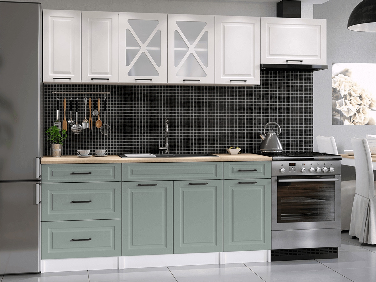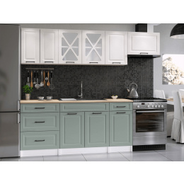 Kuchyňská linka Magda je vyrobená ve venkovském stylu, který se hodí do kuchyně v paneláku i v rodinném domě. Tento styl má jedinečnou schopnost proměnit Vaši kuchyň v útulnou a zároveň funkční místnost, kde bude radost vařit i péct. Kuchyňská linka Magda nabízí dostatek úložného i pracovního prostoru. Všechny skříňky jsou samostatné, takže si je můžete sestavit tak, jak Vám to vyhovuje. Korpusy skříněk jsou vyrobené z lamina 18 mm s hranami ABS a dvířka jsou MDF 16mm. Všechny skříňky jsou dodávány v demontu. Součástí balení je montážní plánek včetně všech potřebných spojovacích prvků. Cena je uvedna za sestavu vyobrazenou na úvodní fotografii BEZ PRACOVNÍ DESKY, s úchytkami, které jsou vyobrazeny v doplňkových fotografiích. Pracovní desku lze dokoupit nad každou skříňku zvlášť podle její šíře. Vyobrazené spotřebiče, dřez, baterie, doplňky a dekorace nejsou v ceně. Kuchyň bude dodaná s bílými korpusy a dvířky v kombinaci bílá a světle zelená. Zobrazení barev na fotografii se může od skutečnosti lišit.