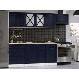Kuchyňská linka Magda je vyrobená ve venkovském stylu, který se hodí do kuchyně v paneláku i v rodinném domě. Tento styl má jedinečnou schopnost proměnit Vaši kuchyň v útulnou a zároveň funkční místnost, kde bude radost vařit i péct. Kuchyňská linka Magda nabízí dostatek úložného i pracovního prostoru. Všechny skříňky jsou samostatné, takže si je můžete sestavit tak, jak Vám to vyhovuje. Korpusy skříněk jsou vyrobené z lamina 18 mm s hranami ABS a dvířka jsou MDF 16mm. Všechny skříňky jsou dodávány v demontu. Součástí balení je montážní plánek včetně všech potřebných spojovacích prvků. Cena je uvedna za sestavu vyobrazenou na úvodní fotografii BEZ PRACOVNÍ DESKY, s úchytkami, které jsou vyobrazeny v doplňkových fotografiích. Pracovní desku lze dokoupit nad každou skříňku zvlášť podle její šíře. Vyobrazené spotřebiče, dřez, baterie, doplňky a dekorace nejsou v ceně. Kuchyň bude dodaná s bílými korpusy a dvířky ve tmavě modré barvě. Zobrazení barev na fotografii se může od skutečnosti lišit.