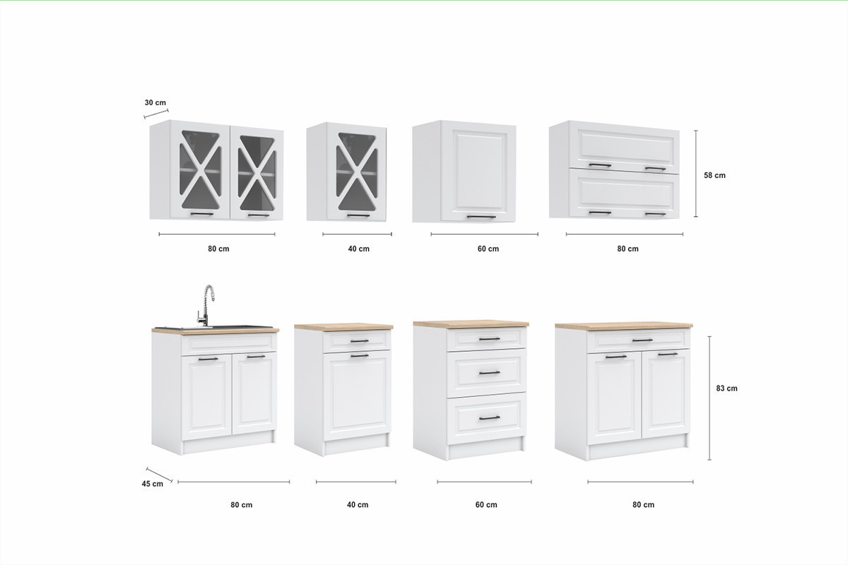 Kuchyňská linka Tyra je vyrobená ve velmi oblíbeném skandinávském stylu, který se hodí do kuchyně v paneláku i v rodinném domě. Tento styl má jedinečnou schopnost proměnit Vaši kuchyň v útulnou a zároveň funkční místnost, kde bude radost vařit i péct. Kuchyňská linka Tyra nabízí dostatek úložného i pracovního prostoru. Všechny skříňky jsou samostatné, takže si je můžete sestavit tak, jak Vám to vyhovuje. Korpusy skříněk jsou vyrobené z lamina 18 mm s hranami ABS a dvířka jsou MDF 16mm. Všechny skříňky jsou dodávány v demontu. Součástí balení je montážní plánek včetně všech potřebných spojovacích materiálů. Cena je uvedena za sestavu vyobrazenou na úvodní fotografii BEZ PRACOVNÍ DESKY, s úchytkami, které jsou vyobrazeny v doplňkových fotografiích. Pracovní desku lze dokoupit nad každou skříňku zvlášť podle její šíře. Vyobrazené spotřebiče, dřez, baterie, doplňky a dekorace nejsou v ceně. Zobrazení barev na fotografii se může od skutečnosti lišit.
