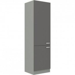 Tato vysoká kuchyňská skříň určená pro vestavěnou lednici a mrazák je vyrobena z lamina tloušťky 16 mm šedé lesklé barvy a skvěle vám doplní kuchyňskou sérii. Korpus skříňky je v šedém provedení. Na dvířkách jsou kovové úchytky ( délka 135mm). Dveře jsou vybaveny systémem tichého zavírání. Lednice nesmí být vyšší než 177cm. Dolní část skříně je určena pro mrazák, který nesmí být vyšší než 71cm.