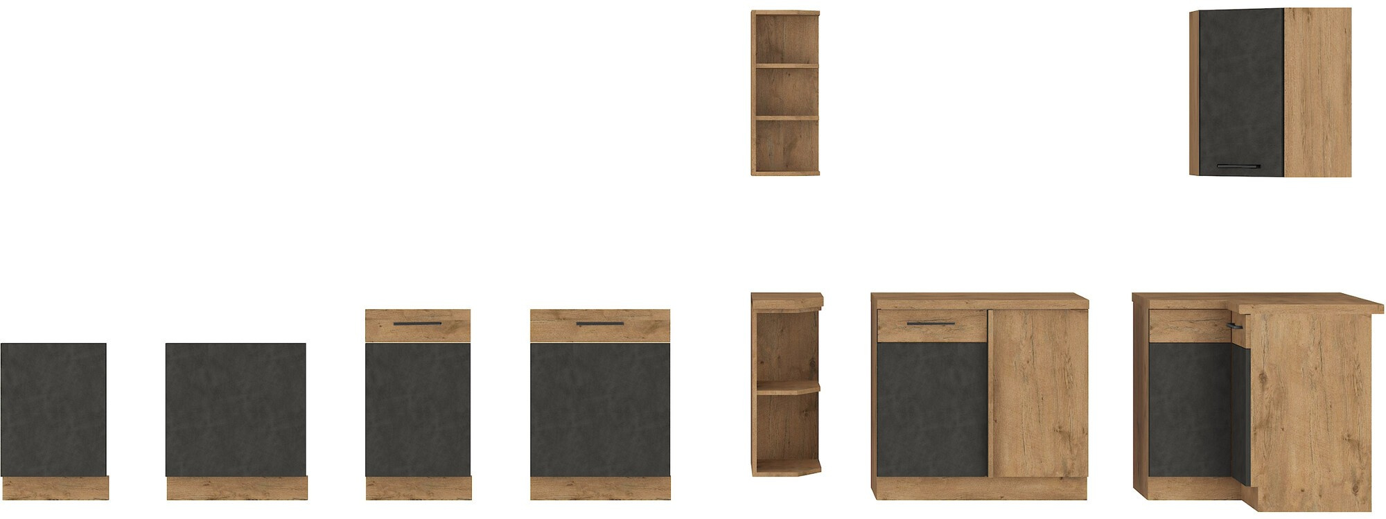 - Dvířka a čela šuplíků jsou vyrobeny z laminované desky 16 mm v kombinaci barev Dub Lancelot / Matera