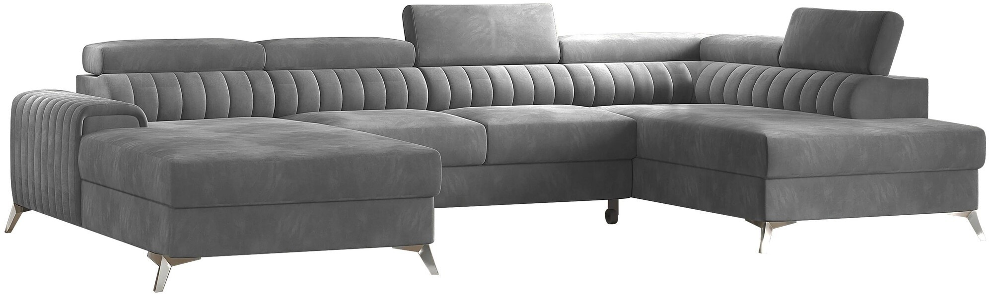 The Lacante corner sofa invites you to relax and take a moment to rest, and it looks perfect at the same time. Moreover, it elevates the modern living space with its interesting body, as well as designer steel chrome legs with a height of 9 centimeters. Lacante also has cozy upholstery to choose from, and as an upholstered furniture manufacturer, we use only the highest quality fabrics. The seat of the furniture is filled with a combination of HR and T30 foams, which provide real comfort. The Lacante corner sofa is also equipped with a bedding container with dimensions: 195 x 93 cm. The corner sofa's advantage is also a sleeping function with an area of 265 x 123 cm. The furniture owes its ability to unfold to the built-in dolphin mechanism. This system is characterized by smoothness and ease of use, so you don't need much strength to cope with turning the corner into a bed. The seat of the corner sofa, made of corrugated spring and a combination of highly elastic HR foam and T30 foam, will certainly promote comfortable rest. And let's not forget the modern adjustable headrests. Thanks to them, you can comfortably lay back and calmly talk, read a book or watch TV. Lacante corner sofa will work well in a traditional, but also in a modern home.