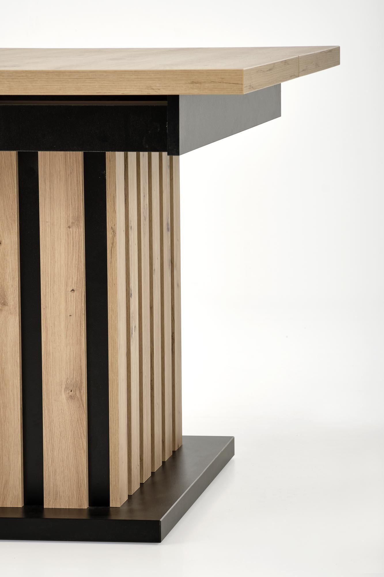 wymiary: 130-180/80/76 cm stół rozkładany, materiał: płyta meblowa laminowana, kolor: blat - dąb artiasan, nogi - dąb artisan / czarny