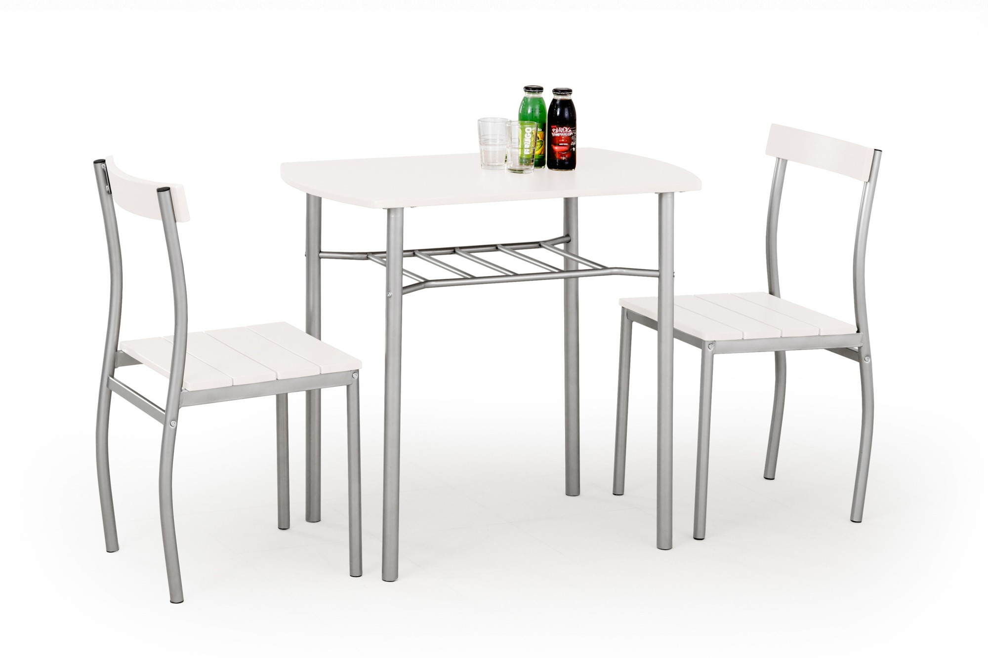 asztal mérete: 82/50/75 cm, anyag: asztallap és ülőfelületek - laminált MDF lap, keret - porszórt acél, szín: fehér