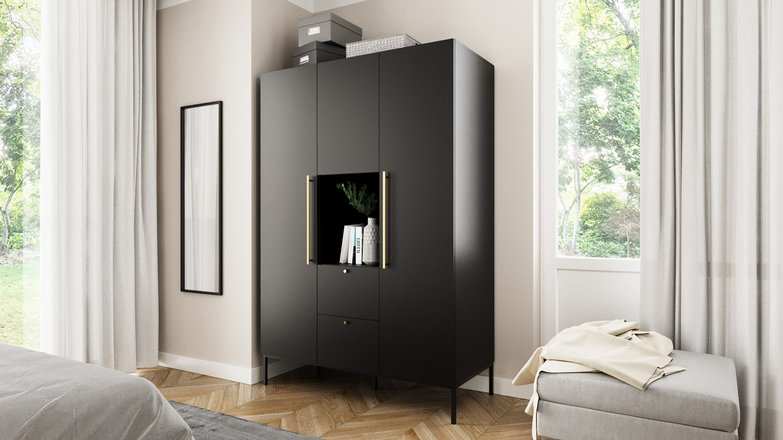 The large Lanzzi closet combines great design, practicality, functionality and plenty of storage space. The furniture is divided into three zones. The first is a place with a bar for hangers, higher up is a shelf for folding closet items. In the middle part there is an alcove that can be used as a display area. Above that, too, there are shelves for clothes. Two capacious drawers at the bottom are additional hidden space in the Lanzzi closet. On the right side, a single-door cabinet with five shelves has been incorporated behind a lockable door, which will provide roomy compartments for shoes, hats, shirts and all folded clothing. Interesting in the design of the Lanzzi closet are the black metal legs, which raise the piece of furniture 20 centimeters above the ground. Lanzzi closet is made of thick and rigid laminated MDF and available in two color options.Choice of two color options Includes wardrobe bar Powder-coated steel black legs Height: 200 cm Depth: 60 cm Width: 135 cm Weight: 127 kg Frame color: black Plastic configuration: black matte+artisan oak / black matte+black matte Material: MDF Board Design of feet: metal Height of feet: 20 cm Number of doors: 3 Number of shelves: 9 Number of open shelves: 1 Number of drawers: 2 Hanger rail: 1