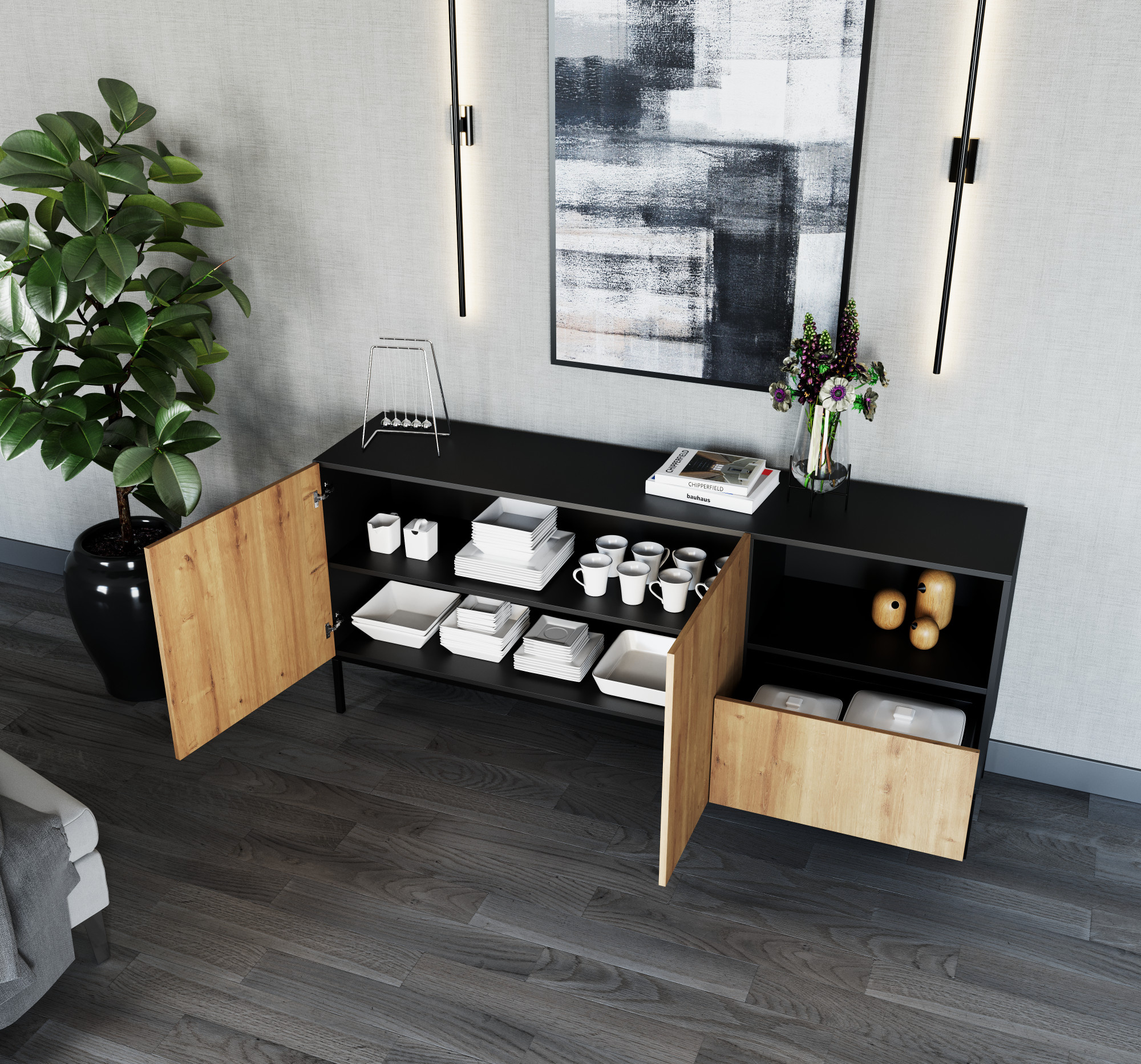The large Lanzzi dresser with one spacious drawer has a clean silhouette and a neutral, solid finish that blends in with almost any color palette. The drawer opens smoothly and is nearly silent, thanks to a quiet-closing function. In addition, the dresser features two, large shelves that are hidden behind a pair of lockable doors. The third shelf is not covered, which gives the opportunity to display, for example, photos or candles. Nearly two meters wide, the Lanzzi chest of drawers allows you to hide a large amount of spare bedding, shirts, pants and other closet essentials. The furniture's matte colors were created in the following configurations: matte black combined with artisan oak and matte black only. This gives you the opportunity to choose from the popular black color and the wood associated with nature. An addition to the black option are gold handles. While the second version opens with "push to open" hinges, which only need to be pressed lightly to use the shelves or drawers in the Lanzzi dresser. Black metal legs of 20 cm give the furniture a sense of stability, and at the same time are an interesting addition.Available in two color versionsHeight: 80 cm Depth: 40 cm Width: 180 cm Weight: 51 kg Plastic configuration: black matte+artisan oak / black matte+black matte Frame color: black Material: MDF board Design of legs: metal Height of legs: 20 cm Number of drawers: 1 Number of doors: 2 Number of closed shelves: 2 Number of open shelves: 1