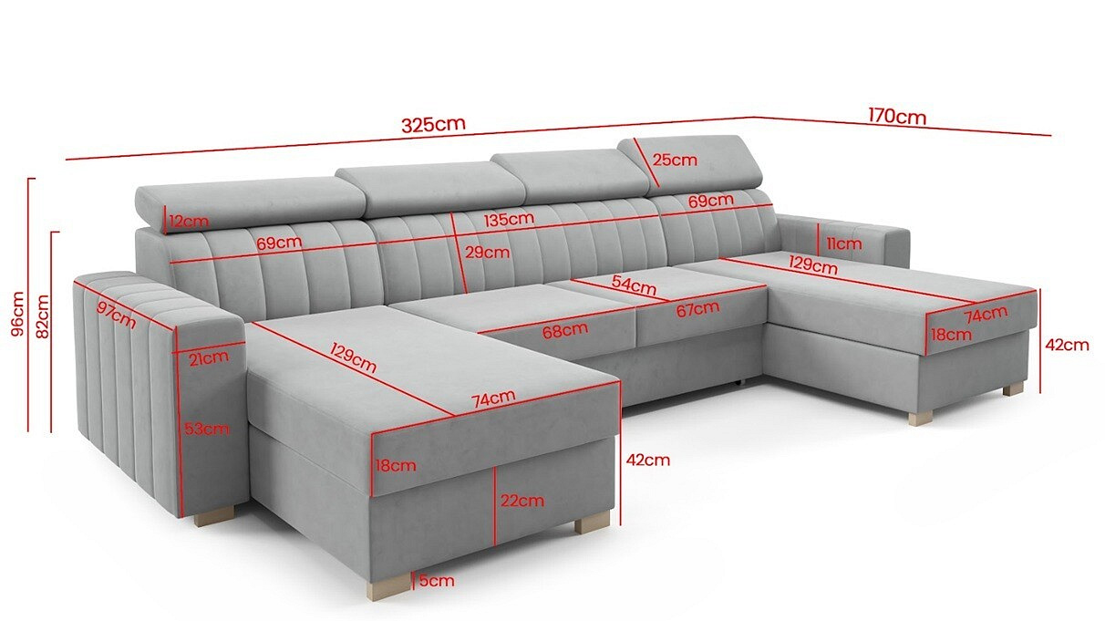 Elegáns vonalai és minőségi anyagai garantálják, hogy nemcsak praktikus, hanem esztétikus kiegészítője is lesz otthonának. Méreteinek köszönhetően 325 cm szélesség, 170 cm mélység és 96 cm magasság elegendő helyet biztosít az egész család és barátok számára.Funkcionalitás, amit értékelni fog