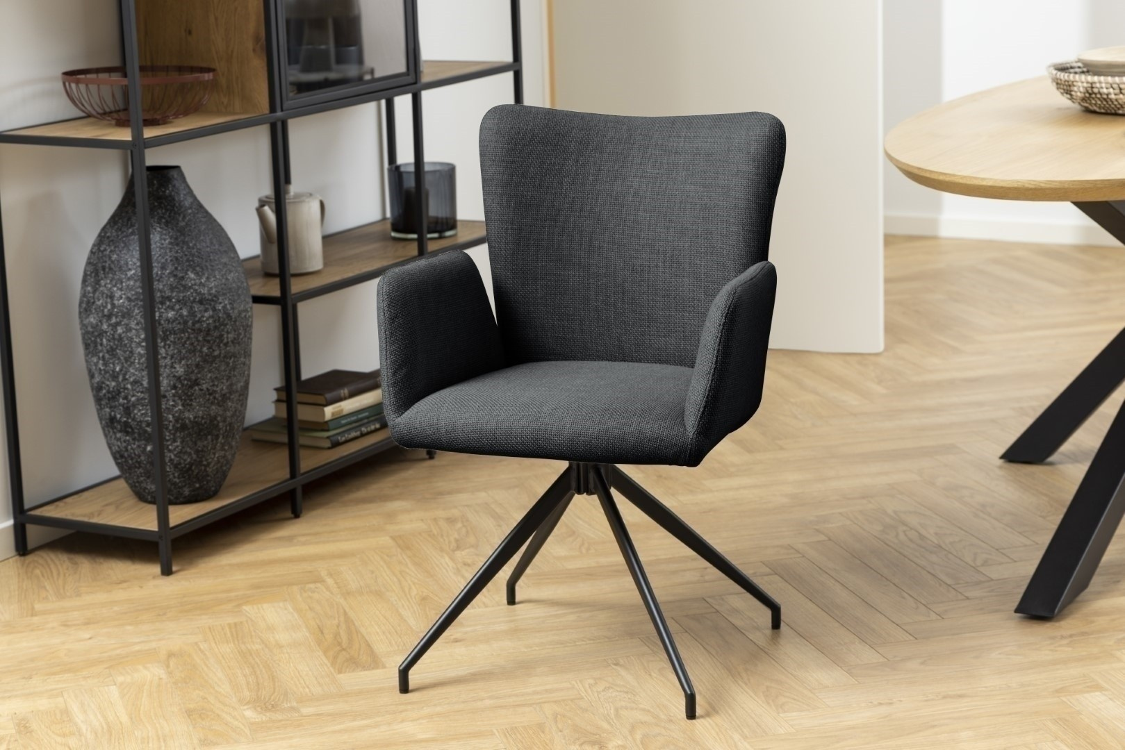 A Laura szék alkalmas tárgyalóterembe, étkezőbe vagy akár egy modern étterembe is. Úgy van kialakítva, hogy a legmagasabb szintű kényelmet biztosítsa. Kényelmes, magas kartámaszokkal rendelkezik. Alapját négy láb alkotja, amelyek fekete színű, matt felületű porszórt festékkel vannak bevonva. A szék forgatható. A szék felső része poliuretán habbal van kitöltve és Basel fabric dark grey 19 szövettel van kárpitozva. Kartondobozok száma: 1 Kartondobozok méretei: 57,5x66x59cm Kartondobozok súlya: 11,7kg