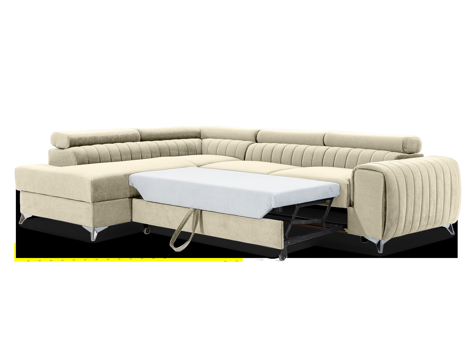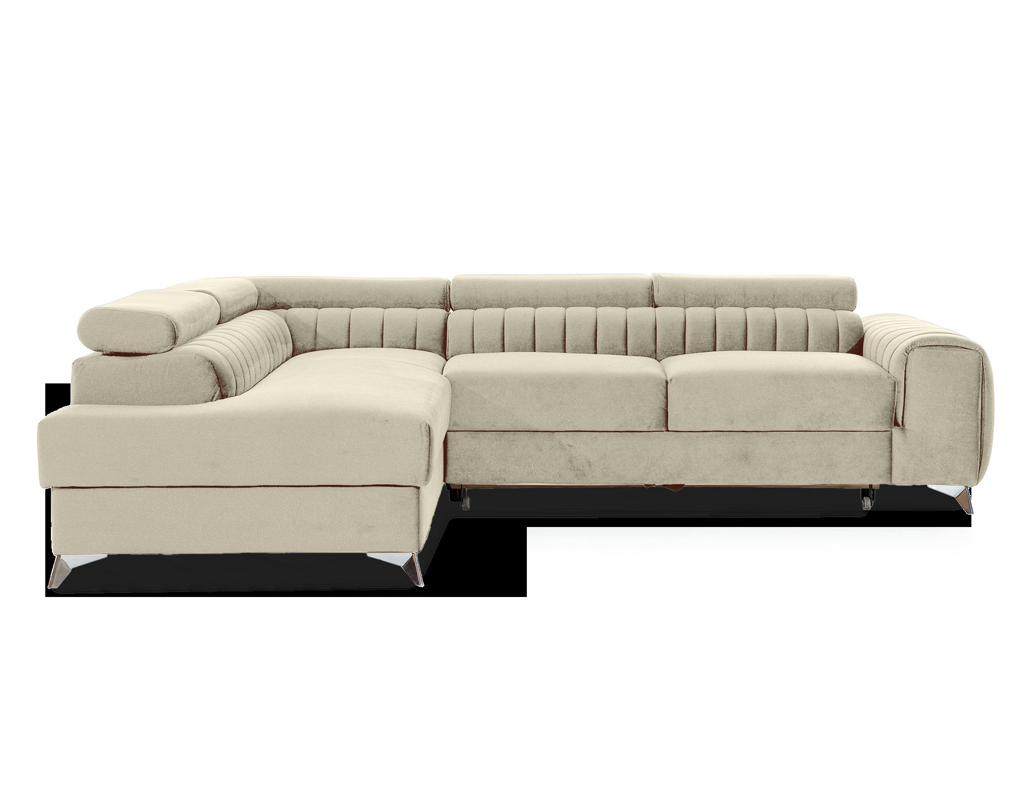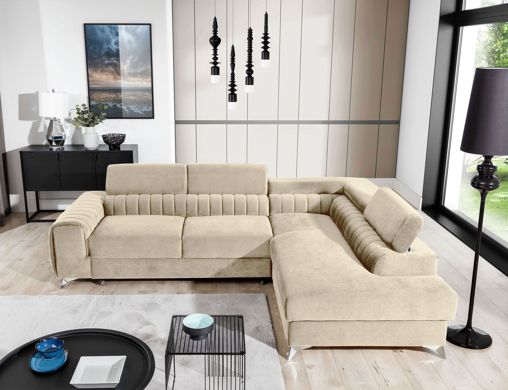 Laurence is a stylish, functional, and above all, elegant corner sofa designed for demanding connoisseurs of comfort. The high level of relaxation is enhanced by adjustable, high headrests and a wide seat. The piece, measuring 278 x 205 x 92 cm, is made with B-type wave springs, T30 foam, and HR foam, ensuring the highest comfort for daily use as a sofa during the day and as a bed after dark, thanks to its dolphin-style mechanism, which makes Laurence suitable for nighttime rest as well. The L-shaped corner sofa is equipped with a sleeping function with a surface of 123 x 193 cm. Additionally, it features a spacious storage compartment for bedding. With elegant stitching and 9 cm steel legs, the sofa maintains a modern finish. The product is available in all fabrics from the Eltap collection. If you are looking for a breath of fresh air and modernist design, Laurence will surely be the perfect choice for you.