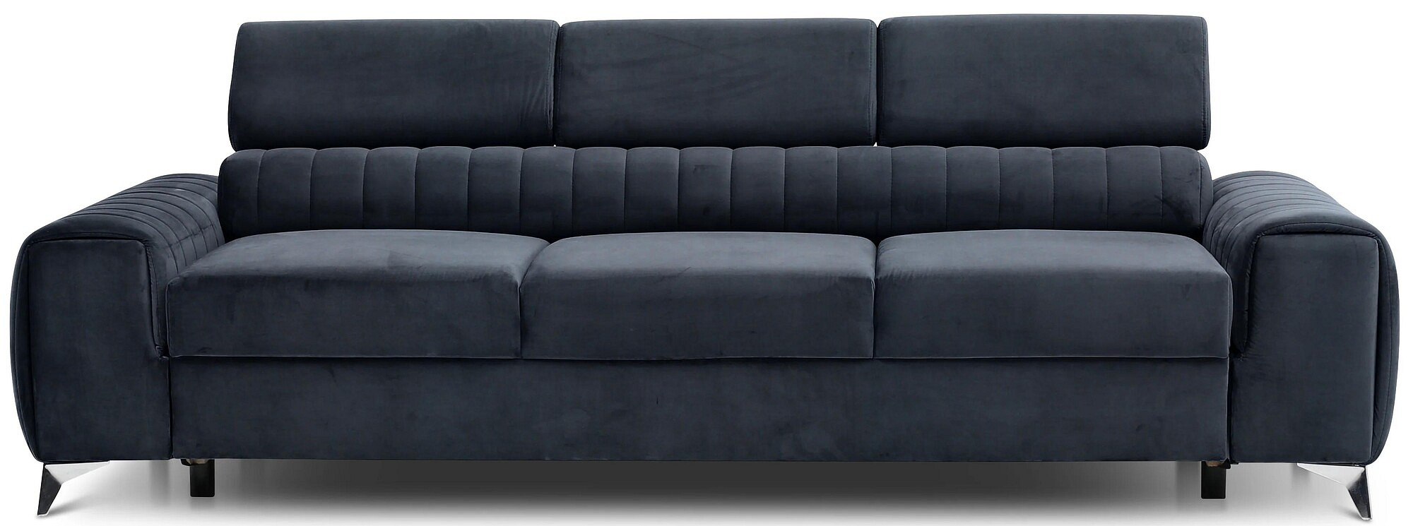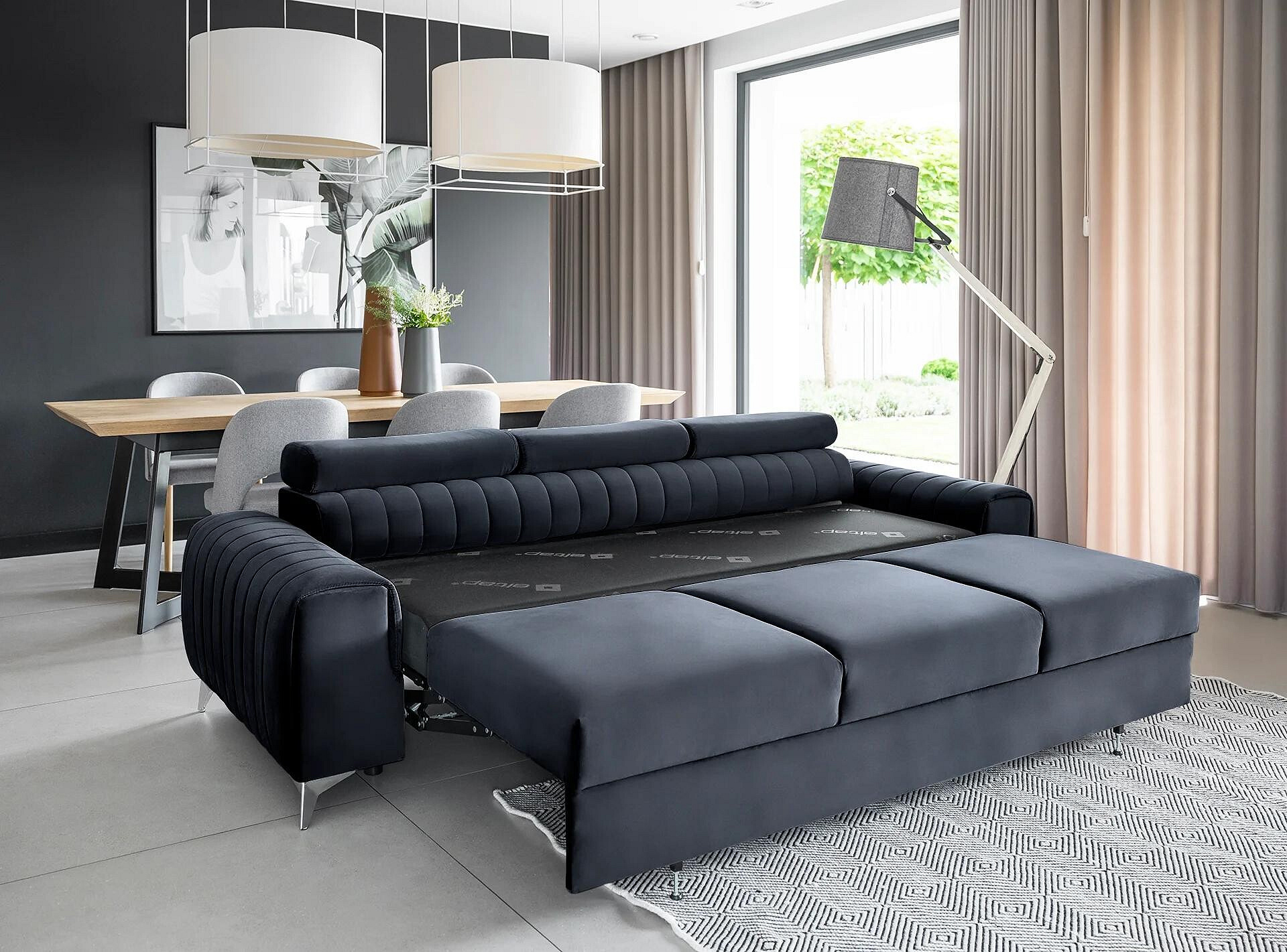 The Laurence couch has a solid wooden frame that rests on slanted, chrome-plated metal legs. This fold-out sofa, wrapped in elegant fabrics from the ELTAP collection, has a seat filled with HR and T30 foams. In addition, the piece of furniture is supported by the solid B-type wave springs, which provide a sense of comfort and convenience. The Laurence couch brings lightness and style to the interior. The classic shape of this piece of furniture is contrasted with stitching and a clearly emphasised division into three seating areas. The Laurence couch is the perfect choice for smaller rooms where you cannot put a corner settee, for example. Its dimensions are: 260 x 97 x 75 centimetres. The height of its legs (10 cm) allows you to clean the floor under the couch with modern cleaning robots. This convertible couch can also become a double bed, which is perfect for transforming any interior into a guest room. The puma plus system was used as the couch’s fold-out mechanism, which requires lifting the seat up and lowering it forward. At the same time, a second sleeping surface automatically slides out from under the seat. The advantage of the puma plus mechanism is that you do not have to worry about damaging the floor when unfolding and folding the sofa. The whole structure is very light and uncomplicated, so anyone can unfold it without any problems. The 199 x 136 centimetres sleeping area provides peaceful sleep for two people.