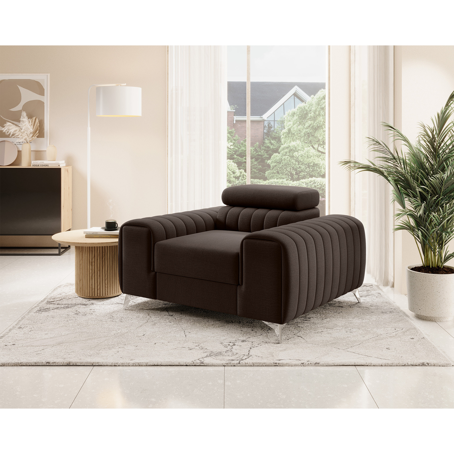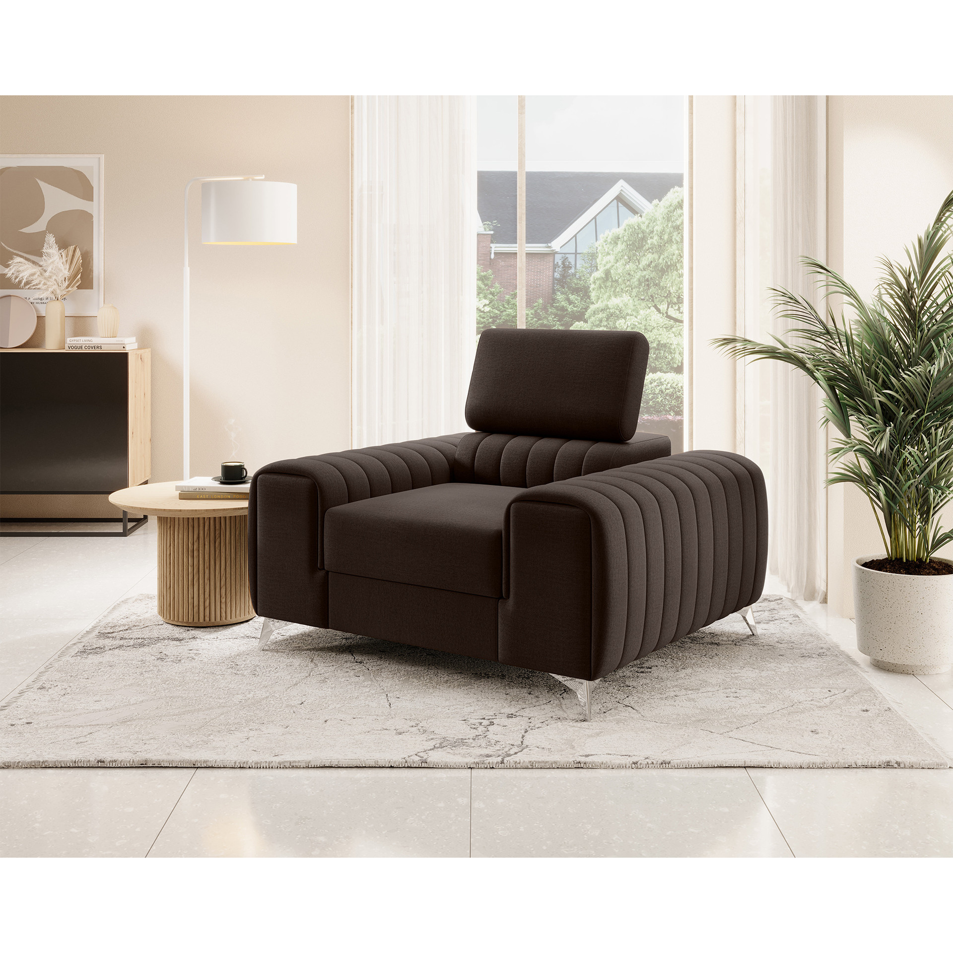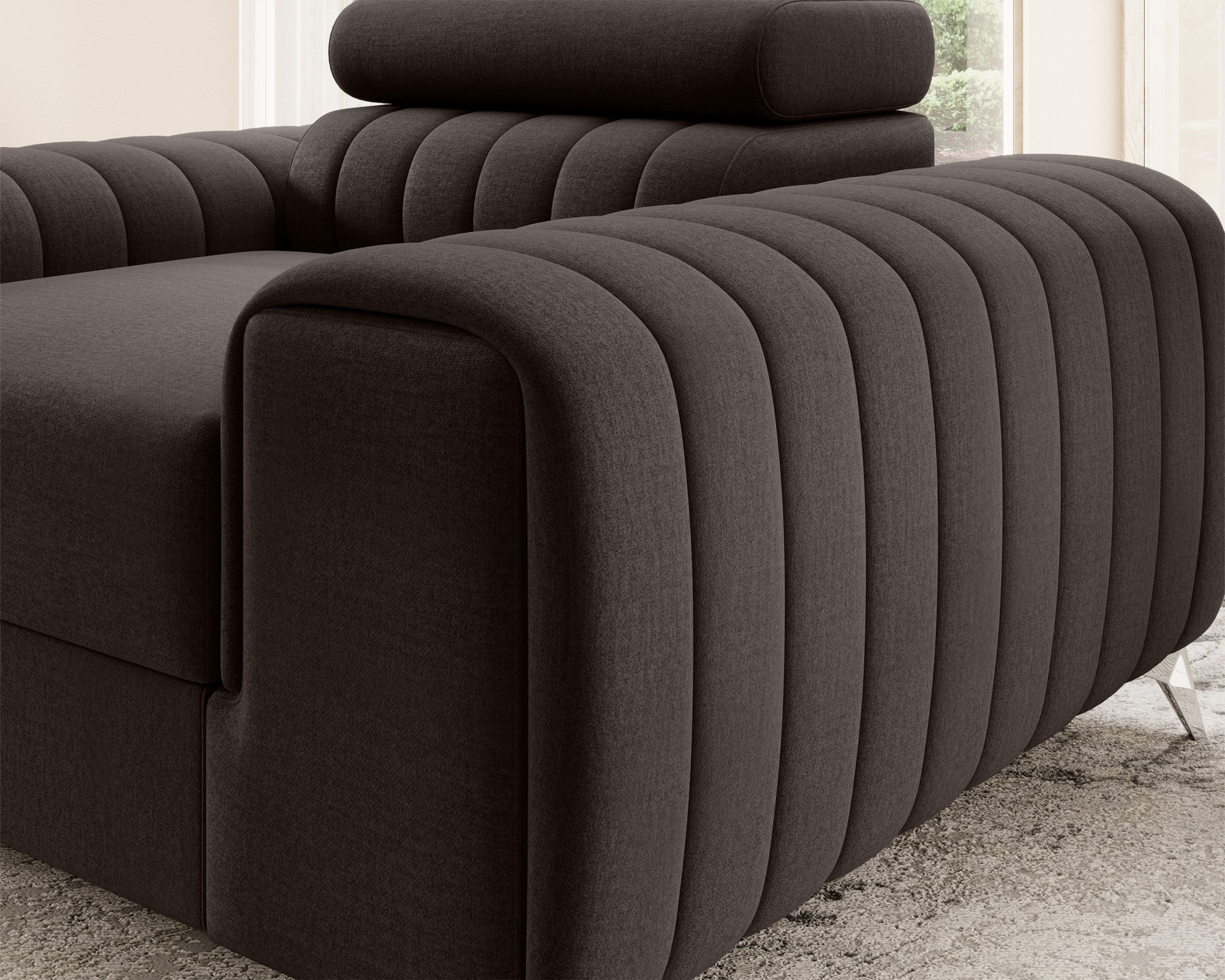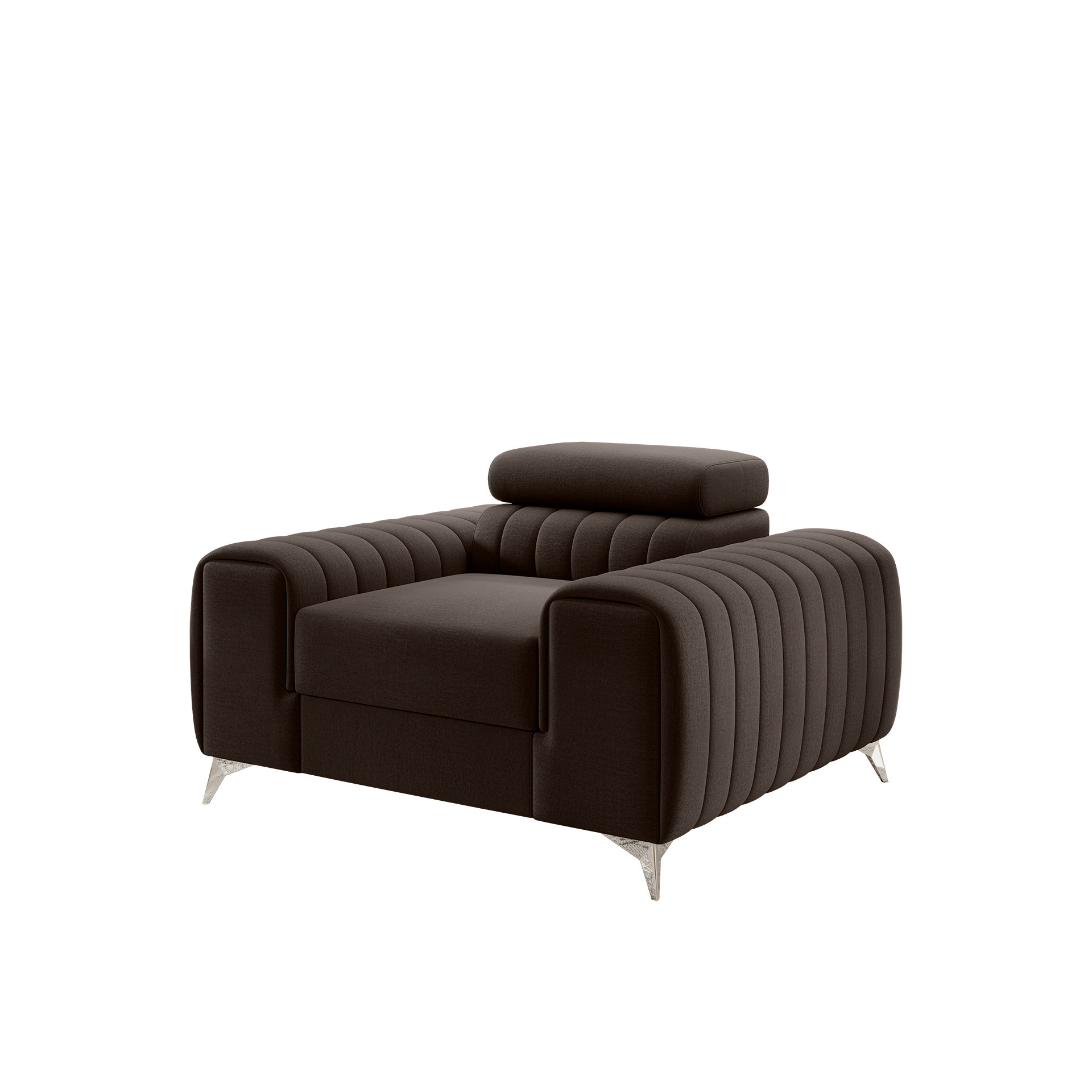 The Laurence armchair is an elegant and comfortable piece of furniture that impresses not only with its designer look but also with its excellent features. Designed with maximum comfort in mind, this armchair will become a true oasis of relaxation in your interior. Its impressive dimensions of 125 cm width and 97 cm depth provide ample seating space. The varied height of the armchair, ranging from 55 to 75 cm, allows for adjustment to individual user preferences. Meanwhile, the seat height of 35 cm ensures a comfortable sitting position. With a seat depth of 55 cm, it guarantees proper back support and a comfortable posture. The Laurence armchair has been designed for users of different heights, which is why the backrest height is adjustable within the range of 30 to 45 cm. This allows for customization according to personal preferences and provides optimal spinal support. Equipped with an adjustable headrest, it allows for tailored neck and head support, providing additional comfort during relaxation. The sturdy legs made of chrome-plated steel, with a height of 9 cm, not only add elegance to the armchair but also ensure stability and durability. The Laurence armchair is not only about its exceptional appearance but also about its solid construction. The seat is filled with T30 density polyurethane foam in combination with HR foam, which perfectly molds to the body, providing softness and comfort. The backrest, on the other hand, is filled with T2540 density foam, ensuring optimal back support. Decorative stitching adds subtle elegance, highlighting its unique character. What's even better is that the Laurence armchair perfectly complements the Laurence corner sofa, creating a perfect furniture set for your interior. This allows you to create a cohesive and harmonious arrangement that will impress all your guests. The Laurence armchair is a combination of style, comfort, and functionality, making your relaxation time even more relaxing and enjoyable.