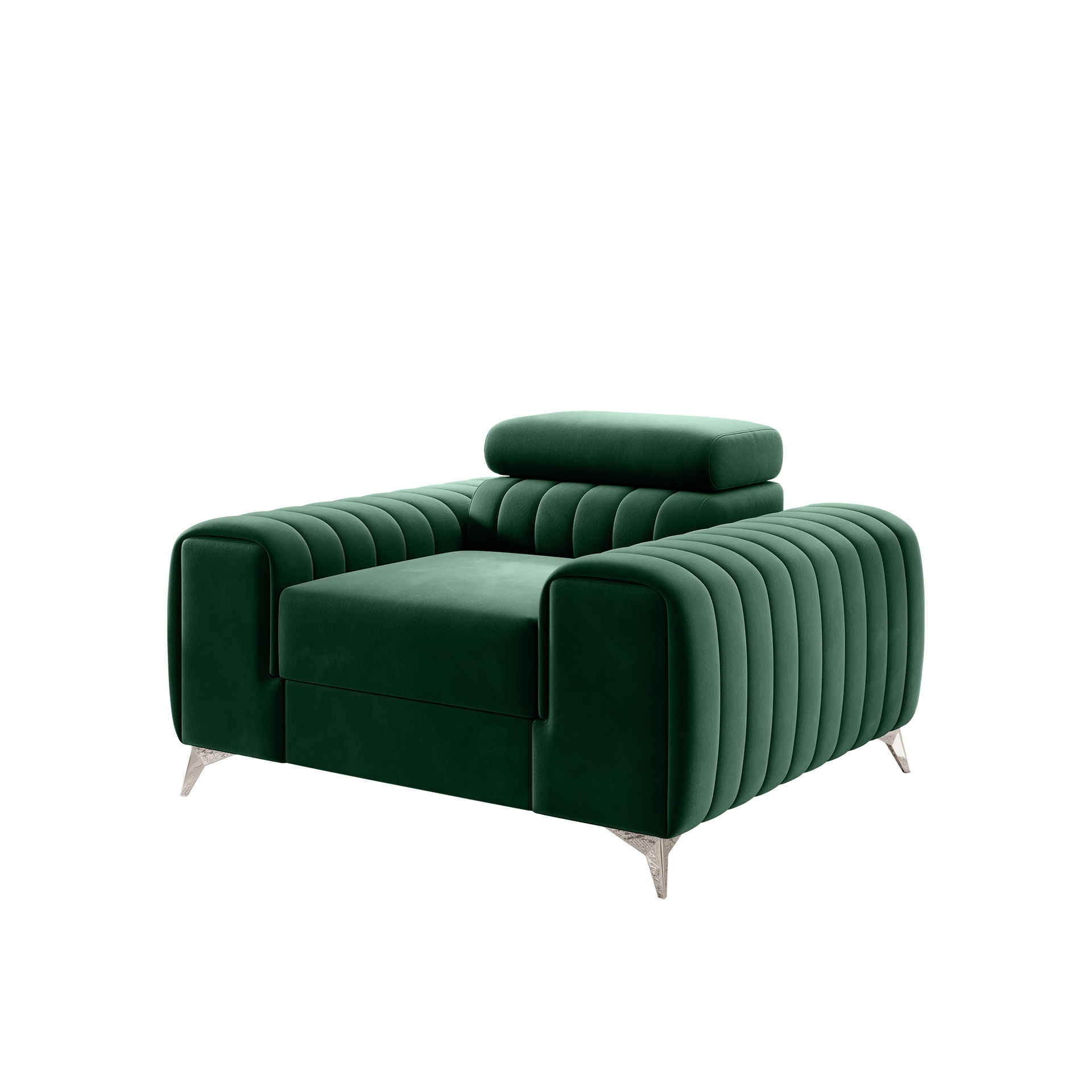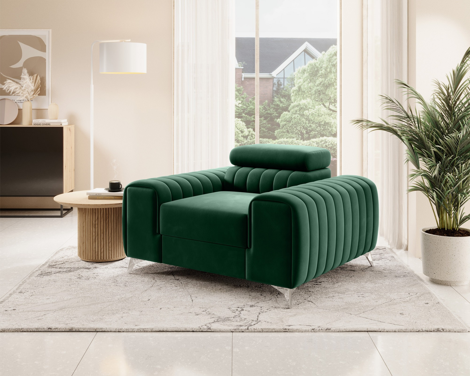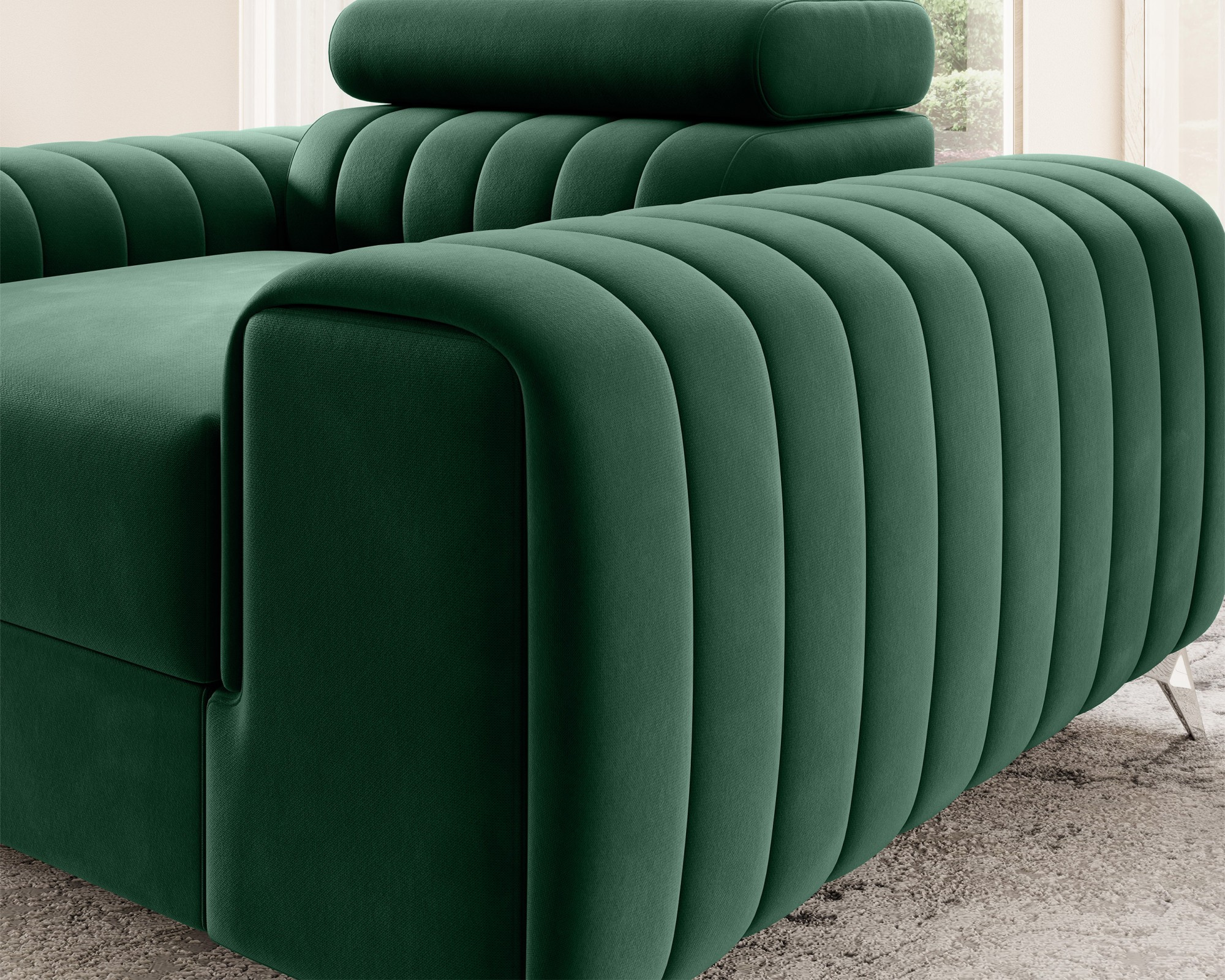 The Laurence armchair is an elegant and comfortable piece of furniture that impresses not only with its designer look but also with its excellent features. Designed with maximum comfort in mind, this armchair will become a true oasis of relaxation in your interior. Its impressive dimensions of 125 cm width and 97 cm depth provide ample seating space. The varied height of the armchair, ranging from 55 to 75 cm, allows for adjustment to individual user preferences. Meanwhile, the seat height of 35 cm ensures a comfortable sitting position. With a seat depth of 55 cm, it guarantees proper back support and a comfortable posture. The Laurence armchair has been designed for users of different heights, which is why the backrest height is adjustable within the range of 30 to 45 cm. This allows for customization according to personal preferences and provides optimal spinal support. Equipped with an adjustable headrest, it allows for tailored neck and head support, providing additional comfort during relaxation. The sturdy legs made of chrome-plated steel, with a height of 9 cm, not only add elegance to the armchair but also ensure stability and durability. The Laurence armchair is not only about its exceptional appearance but also about its solid construction. The seat is filled with T30 density polyurethane foam in combination with HR foam, which perfectly molds to the body, providing softness and comfort. The backrest, on the other hand, is filled with T2540 density foam, ensuring optimal back support. Decorative stitching adds subtle elegance, highlighting its unique character. What's even better is that the Laurence armchair perfectly complements the Laurence corner sofa, creating a perfect furniture set for your interior. This allows you to create a cohesive and harmonious arrangement that will impress all your guests. The Laurence armchair is a combination of style, comfort, and functionality, making your relaxation time even more relaxing and enjoyable.