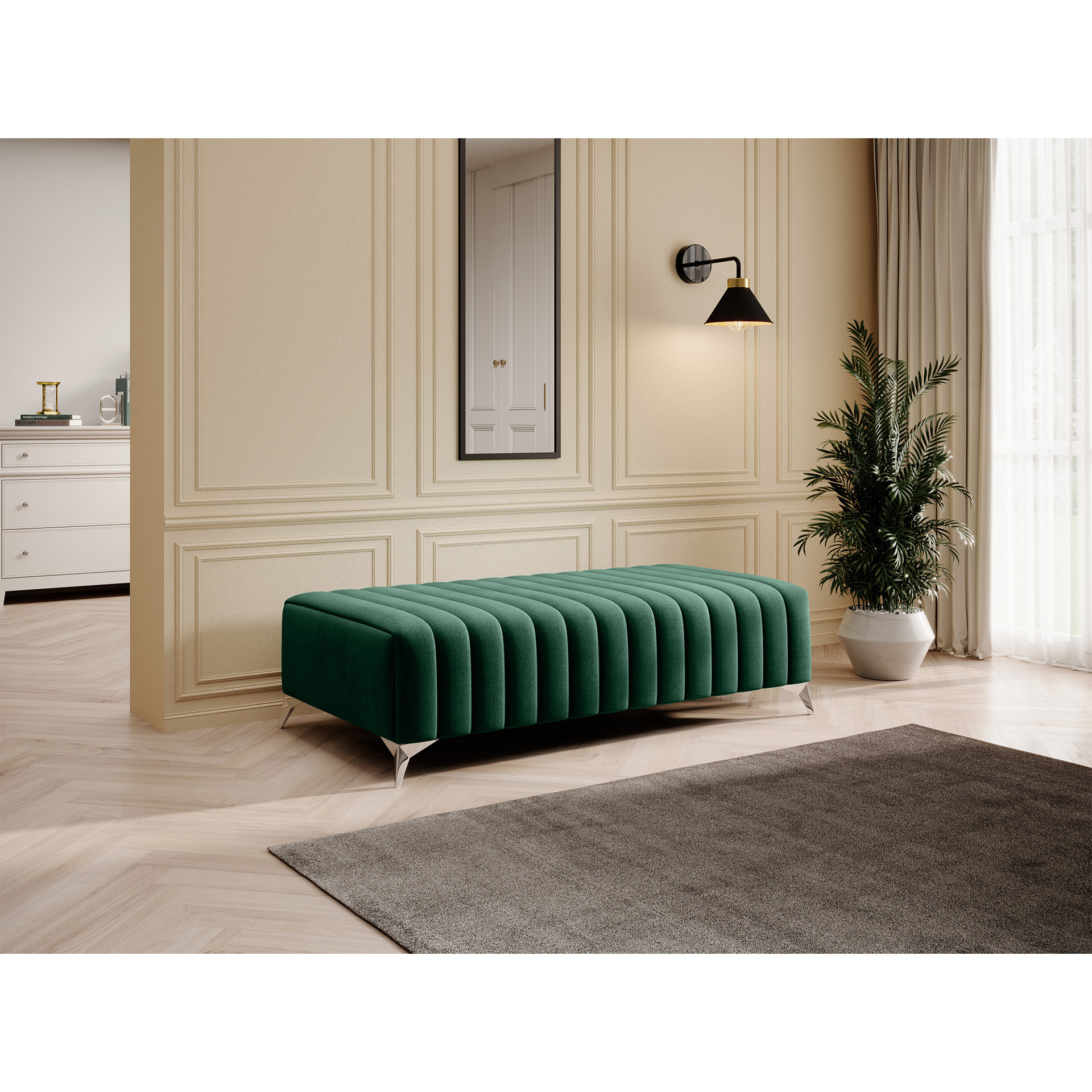 Describe your interior with the stylish and comfortable Pouf Laurence. This exceptional pouf combines perfect design with unparalleled comfort to provide you with relaxing moments and comfortable seating. The B-wave spring ensures durability and stability, maintaining the pouf's shape for many years without risking deformations or distortions. Pouf Laurence is equipped with three types of foam: HR, T3030, and T2130. This combination guarantees perfect body support while providing softness that allows you to fully relax. With dimensions of 64 cm x 132 cm x 36 cm, this pouf will provide you with space for comfortable seating or lying down, depending on your needs. The 9 cm high legs made of chrome-plated steel add stability and elegance, emphasizing the product's unique character. The maximum weight capacity of Pouf Laurence is up to 90 kg, meaning you can sit on it freely without worrying about its durability. Its gross weight is 39 kg, further confirming the solidity of the construction. An additional advantage is the aesthetic decoration in the form of decorative seams, which give the furniture a unique character, making it not only practical but also a stylish element of your interior. With Pouf Laurence, you gain a perfect combination of quality, durability, elegance, and comfort. It's the ideal piece of furniture for those who value high quality and the beauty of their interior. With it, every place will gain a special charm, and you will be able to enjoy moments filled with relaxation and pleasure.