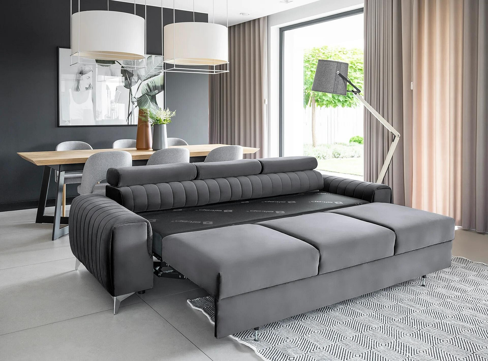 The Laurence couch has a solid wooden frame that rests on slanted, chrome-plated metal legs. This fold-out sofa, wrapped in elegant fabrics from the ELTAP collection, has a seat filled with HR and T30 foams. In addition, the piece of furniture is supported by the solid B-type wave springs, which provide a sense of comfort and convenience. The Laurence couch brings lightness and style to the interior. The classic shape of this piece of furniture is contrasted with stitching and a clearly emphasised division into three seating areas. The Laurence couch is the perfect choice for smaller rooms where you cannot put a corner settee, for example. Its dimensions are: 260 x 97 x 75 centimetres. The height of its legs (10 cm) allows you to clean the floor under the couch with modern cleaning robots. This convertible couch can also become a double bed, which is perfect for transforming any interior into a guest room. The puma plus system was used as the couch’s fold-out mechanism, which requires lifting the seat up and lowering it forward. At the same time, a second sleeping surface automatically slides out from under the seat. The advantage of the puma plus mechanism is that you do not have to worry about damaging the floor when unfolding and folding the sofa. The whole structure is very light and uncomplicated, so anyone can unfold it without any problems. The 199 x 136 centimetres sleeping area provides peaceful sleep for two people.