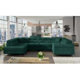 Letto is a spacious, comfortable and upholstered corner sofa of substantial size, measuring 340 x 202 x 90 cm. This U-shaped piece of furniture has a comfortable and soft seat made of durable corrugated spring, as well as high-flexible T30 foam. Letto is equipped with a sleeping function and a spacious bedding storage located in the ottoman. After unfolding the furniture using the dolphin mechanism, we get 125 x 253 cm of surface for night rest. Among the characteristics of the Letto corner sofa we can include: a tasteful seat decorated with delicate quilting, and stylish stitching, adjustable headrests, contoured backrest, high and elegant high gloss chrome legs, which ensure the stability of the entire structure. It is certainly worth having such a corner sofa in your living room.