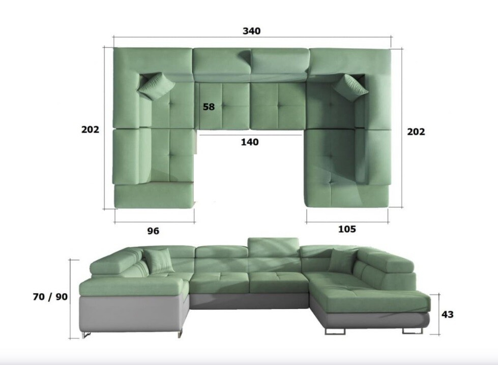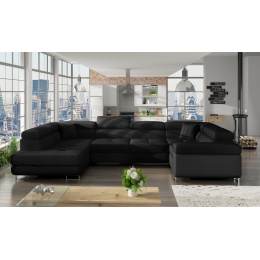 Letto is a spacious, comfortable and upholstered corner sofa of substantial size, measuring 340 x 202 x 90 cm. This U-shaped piece of furniture has a comfortable and soft seat made of durable corrugated spring, as well as high-flexible T30 foam. Letto is equipped with a sleeping function and a spacious bedding storage located in the ottoman. After unfolding the furniture using the dolphin mechanism, we get 125 x 253 cm of surface for night rest. Among the characteristics of the Letto corner sofa we can include: a tasteful seat decorated with delicate quilting, and stylish stitching, adjustable headrests, contoured backrest, high and elegant high gloss chrome legs, which ensure the stability of the entire structure. It is certainly worth having such a corner sofa in your living room.